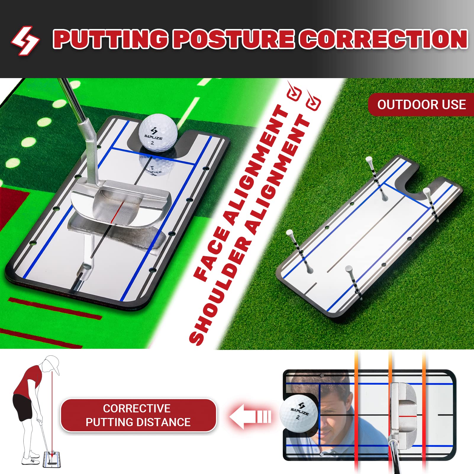 SAPLIZE Golf putting mat with visible ball traces, putting alignment mirror, 20 inches x 10 feet indoor putting mat for home office practice aid.