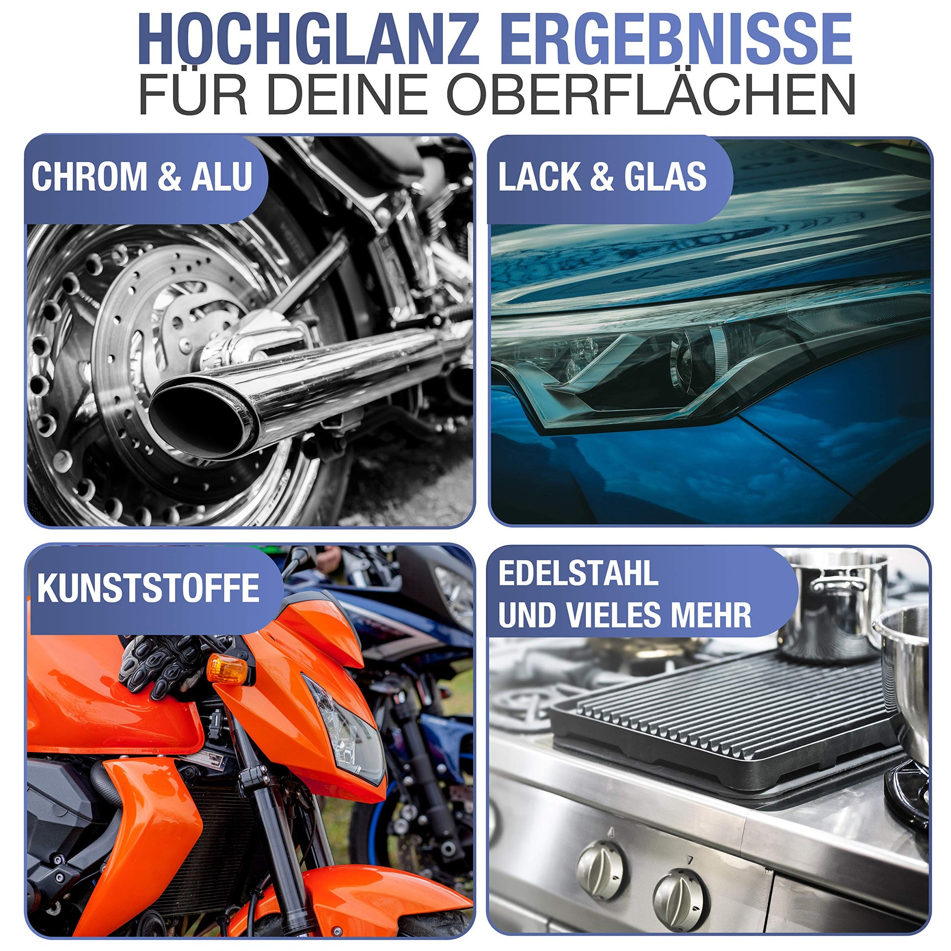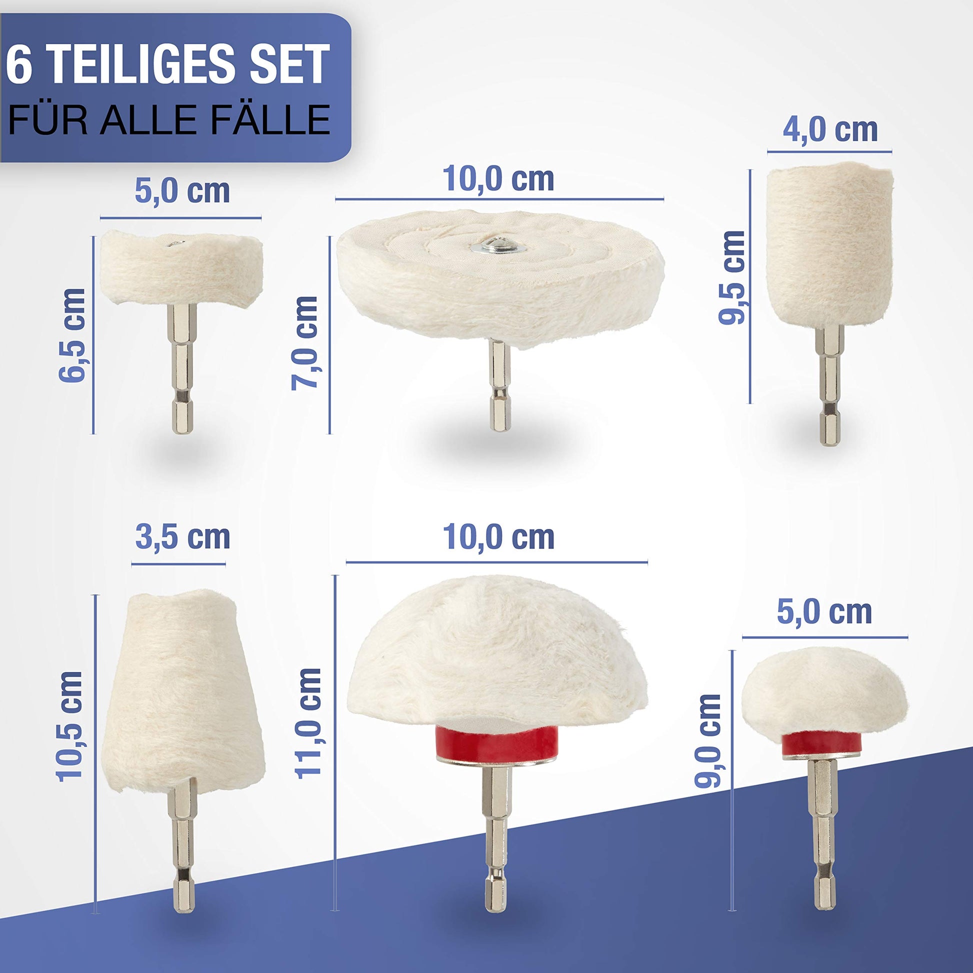 ["✅ VIELSEITIG EINSETZBAR - Das Polierset ist ein echter Allrounder. Es kann sowohl für Metalle wie Edelstahl, Aluminium und Chrom verwendet werden, aber auch für Lack, Glas, Kunststoffe und weitere Materialien!","✅ BESONDERS SCHONEND - Die Polierscheiben bestehen aus weicher Baumwolle, wodurch eine schonende Politur gewährleistet wird. So bringst du das zu polierende Material zu neuem Glanz, ohne es zu verkratzen!","✅ INNOVATIVER SECHSKANTSCHAFT - Die Polieraufsätze verfügen über einen innovativen und 5 cm langen Sechskantschaft. Durch die Länge und die spezielle Form sitzt der Schaft bombenfest im Bohrfutter!","✅ BREITE POLIERSCHEIBE - Die pilzförmige Polierscheibe verfügt über einen extra großen Durchmesser von 100 mm. Somit lassen sich nicht nur kleine Zwischenräume, sondern auch mittelgroße Flächen im Nu polieren!","✅ AUFBEWAHRUNGSTASCHE - In der robusten Aufbewahrungstasche kannst du das Polier Set platzsparend und vor Schmutz geschützt verstauen. Gleichzeitig lassen sich die Polier Aufsätze darin komfortabel transportieren!"]