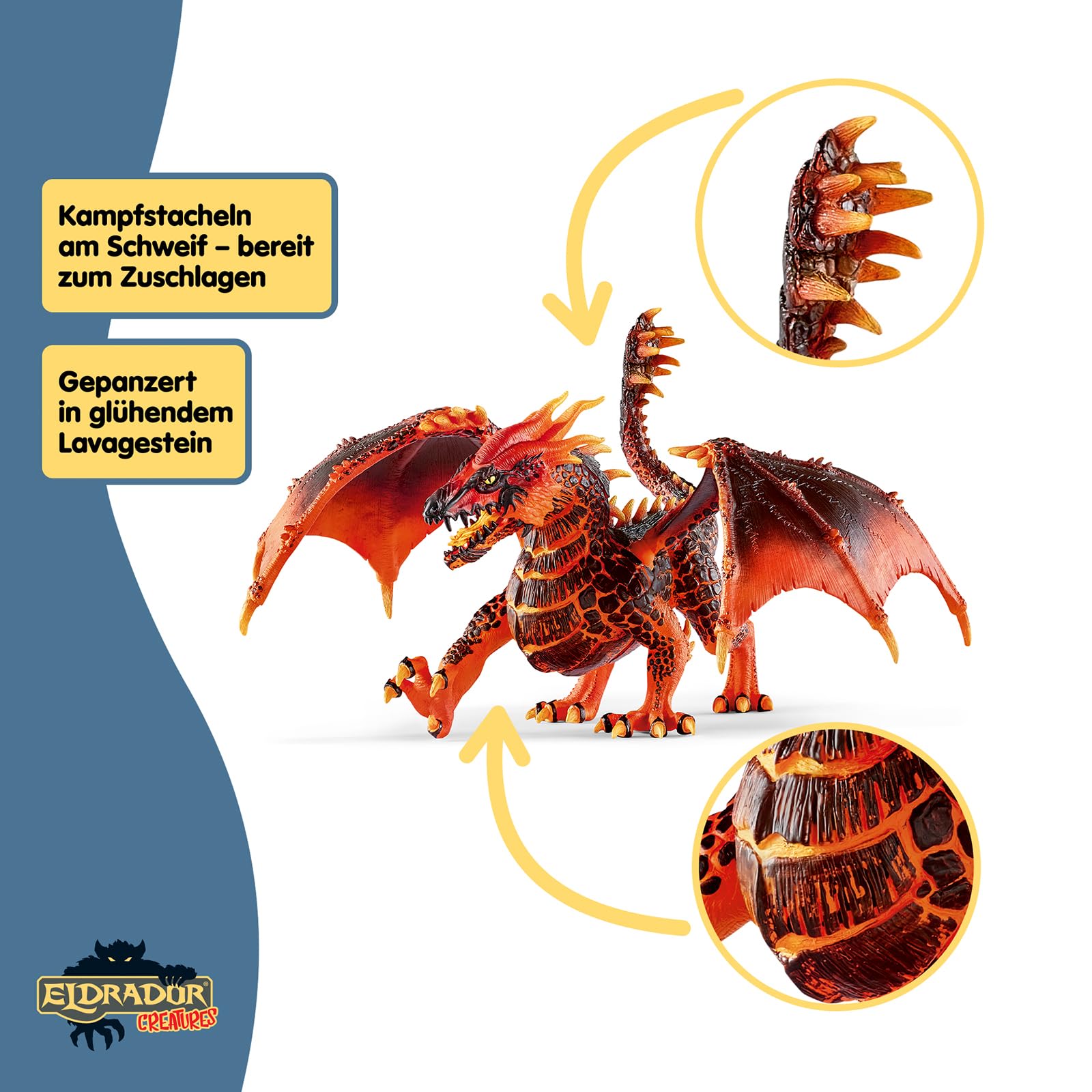 ["LOVE FOR DETAIL - With sharp wings, glowing eyes, and flaming scales, the schleich Lava Dragon brings fiery excitement to the kids' room - ideal for daring adventures in ELDRADOR!","MOVING FIGURE - The movable wings and the opening mouth make the Lava Dragon the perfect schleich action figure - for dynamic battles, creative play, and long-lasting fun.","RULER OF THE LAVA WORLD - This ELDRADOR Monster reigns over volcanoes and ashes! Combined with the BATTLE CAVE or Jet, the schleich battle toy becomes the center of epic battles for the Super Weapon.","ELDRADOR CREATURES - Let your child plunge into funny battles and challenge monsters from five worlds: Lava World, Ice World, Jungle World, Stone World, and Shadow World! Who will conquer the Super Weapon?","STORIES WITHOUT LIMITS - With schleich figures, children discover detailed, durable play worlds. High quality and sustainability ensure years of fun and loyal companions."]