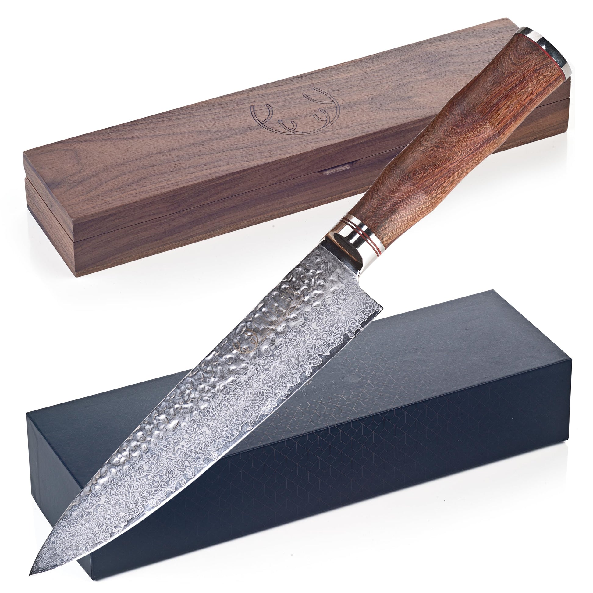 SCHWARTZHIRSCH® Caliburn - The handcrafted chef's knife made from Japanese Damascus steel with a fine genuine wood handle in an exclusive walnut wood box (20cm, Damascus knife, gift packaging)