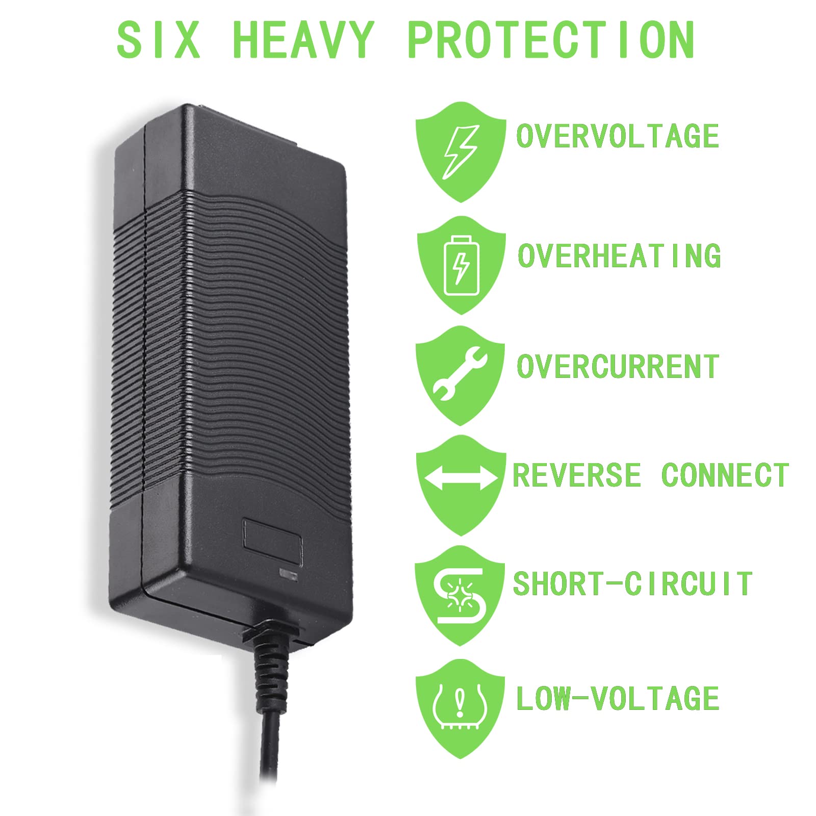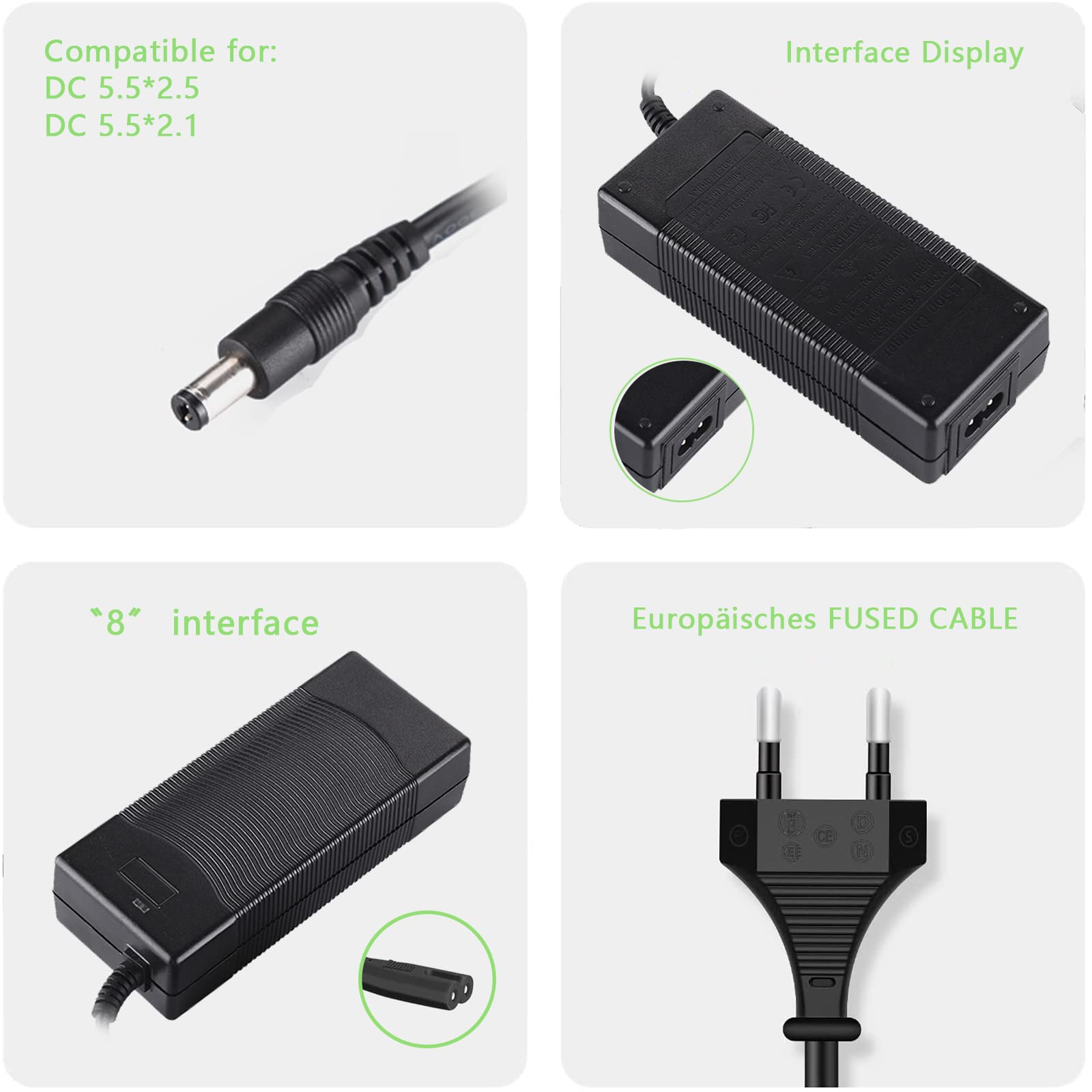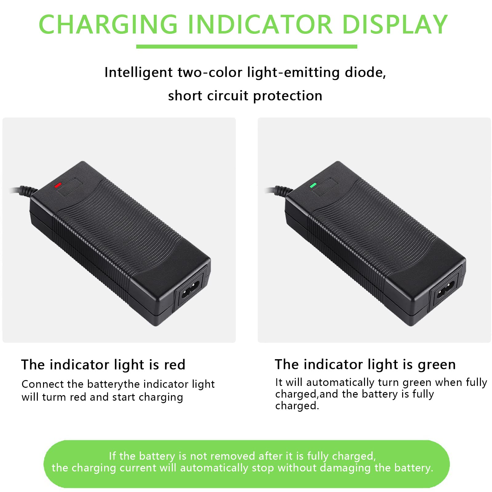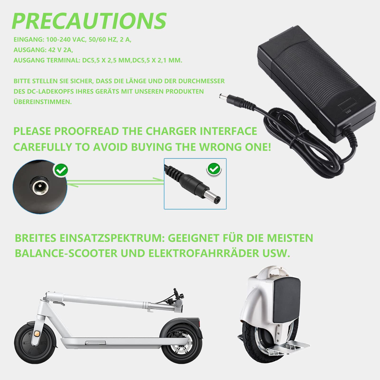 ["Input: 100-240 VAC, 50/60 Hz, 2 A, Output: 42 V 1.5A, Output terminal: DC5.5 x 2.5 mm, DC5.5 x 2.1 mm. Please make sure the length and diameter of the DC charging head of your device match our products.","Wide range of applications: Suitable for most balance scooters and electric bicycles, etc.","Safety protection: With AC adapters featuring short circuit and overload and overcurrent and overvoltage protection, as well as automatic recovery and maximum power protection, premium fuses protect smart boards from burning out.","High quality: The electric scooter battery charger is made of high-quality material for good quality, is strong and durable, not easily damaged, and has a long service life.","Light indication: Red light indicates charging, green light indicates complete charging or disconnection."]