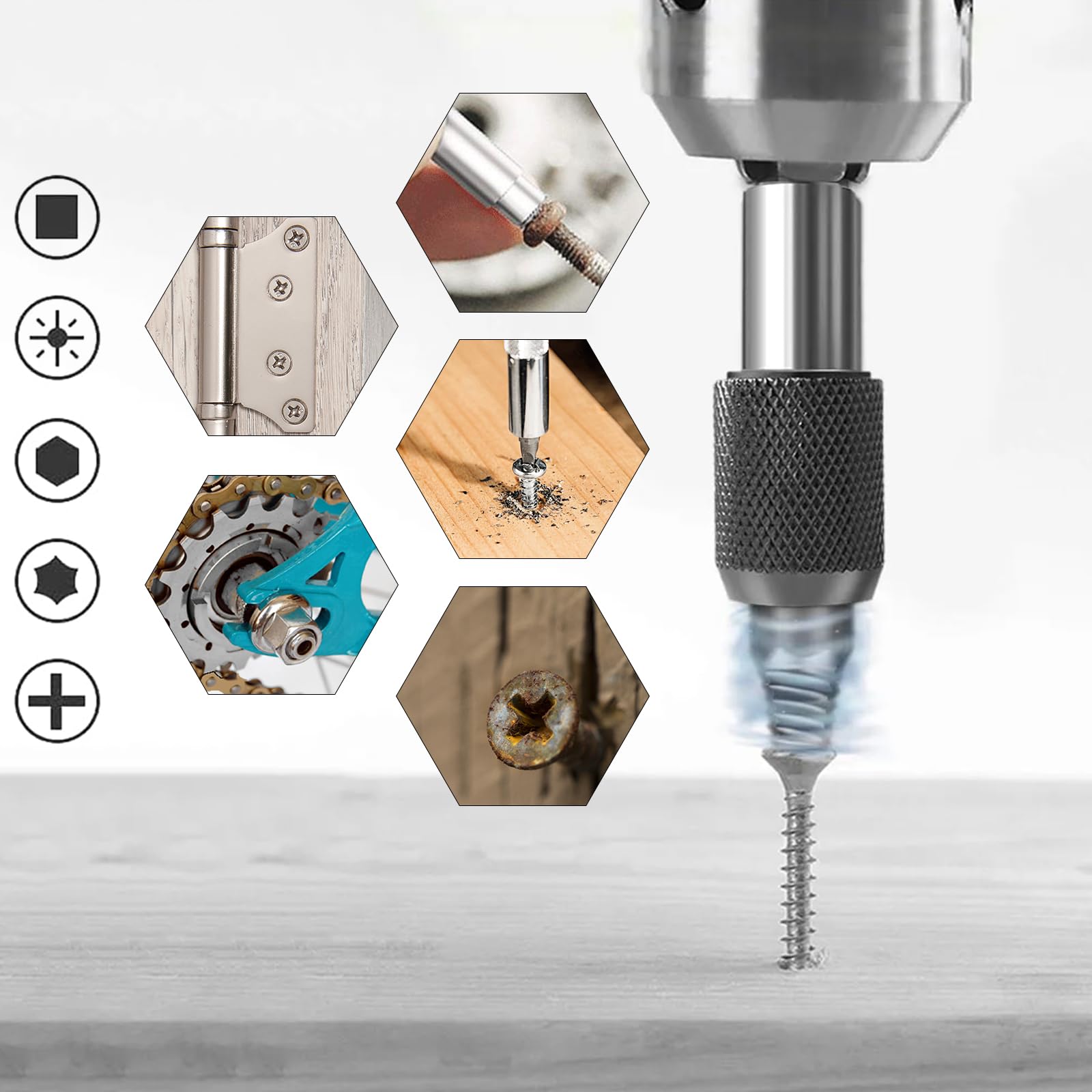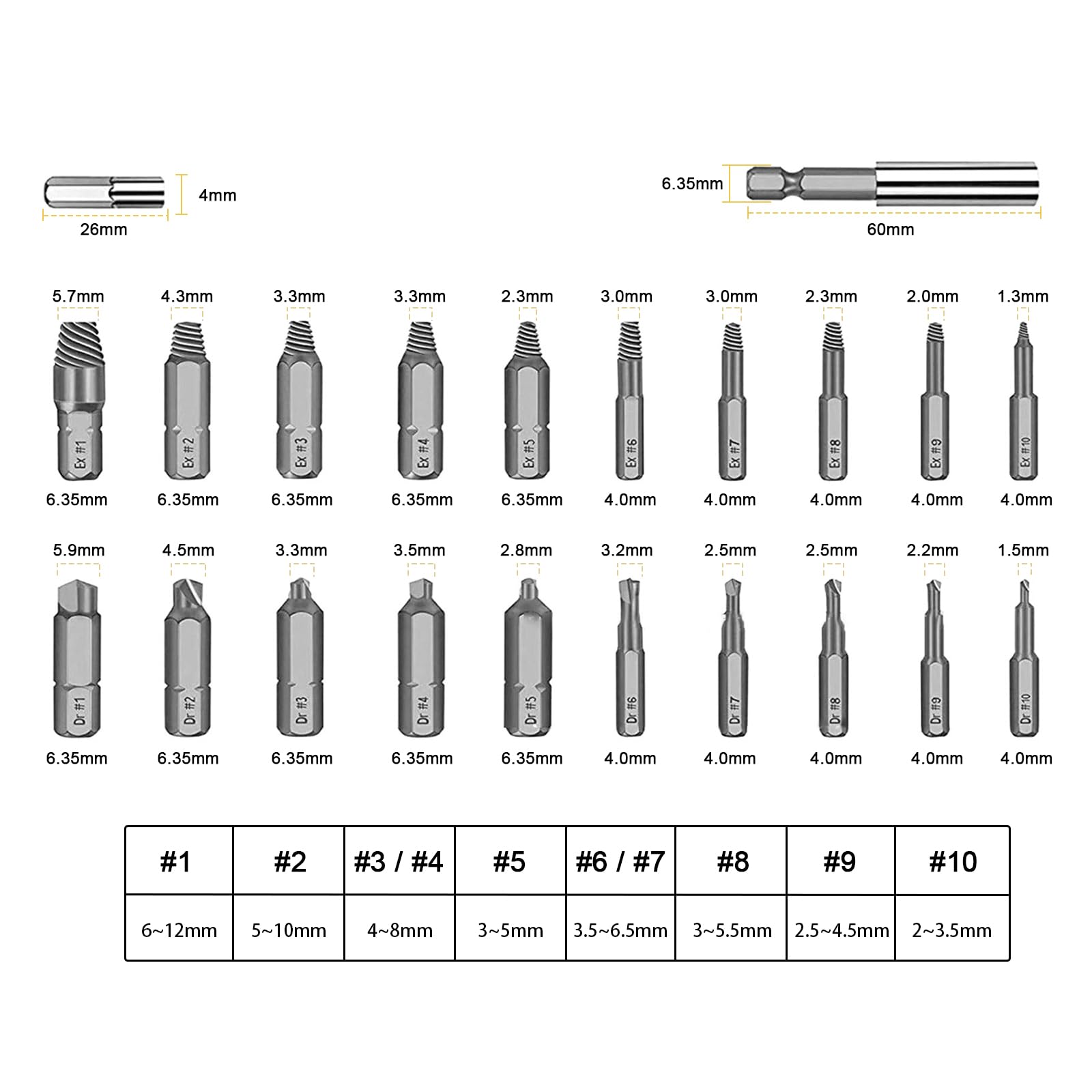 ["22-piece Screw Extractor Set: Includes 10 pieces of drills (Dr#1, #2, #3, #4, #5, #6, #7, #8, #9, #10) and 10 pieces of extractors (Ex #1, #2, #3, #4, #5, #6, #7, #8, #9, #10). 1 piece of extension bit holder and 1 piece socket adapter, suitable for general sizes and all types of broken bits to remove damaged screws or bolts.","High-strength Steel: Made of high-speed steel 4241, high hardness, durable, suitable for removing stripped screws and broken screws.","Extra Extender: The extension bit holder (6.35mm) and the socket adapter (4mm) of the screw removal set fit all electric drills of any brand; The magnetism inside the holder and the adapter prevents the tips from falling down, fix the drill or extractor and extend the tools to reach what you wanted to drill.","Easy to Use: You only need a drill or an extractor that is smaller than the damaged screw, and insert the drill in reverse during this process, you can easily remove the screw.","Wide Application: The screw removal set is suitable for most drills and various sizes of screws or bolts, such as Allen screws, machine screws, eye screws, wood screws, hex screws, sheet metal screws, and so on. Ideal tool for removing damaged screws and bolts"]