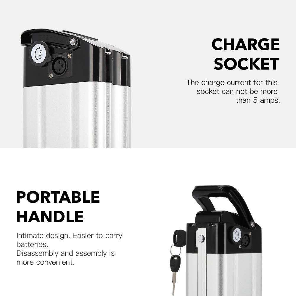 ["With on-site technical support. Solve your problems quickly, no worries, we have experts to handle all your problems.","【Li-ion Battery Parameters】36V 10.4AH 2600mAh cell, suitable for 250W 350W 500W motor. Max. constant discharge current: 20A, Without charger. Discharge connector: Bullet Connectors (Female & Male).","【Installation Notes】Equipped with 2-pin discharge connector for easy installation or removal of the battery. Size: 388*113*75mm/15.28*4.45*2.95inch (LxWxH). 🌈Please make sure the size fits before purchasing!","【Useful Functions】It takes 6-7 hours to fully charge the battery. The power switch can avoid power waste. 🌈If only a red light is on, you need to charge your battery in time.","【Safety & Convenience】🌈Equipped with 20A BMS to protect the battery. Our batteries have passed CE, ROHS, UN38.3 safety certification to ensure user safety in extreme usage scenarios. 🚴♀️Applicable bike types include adult electric mountain bikes, folding electric bikes, city electric bikes, and more."]