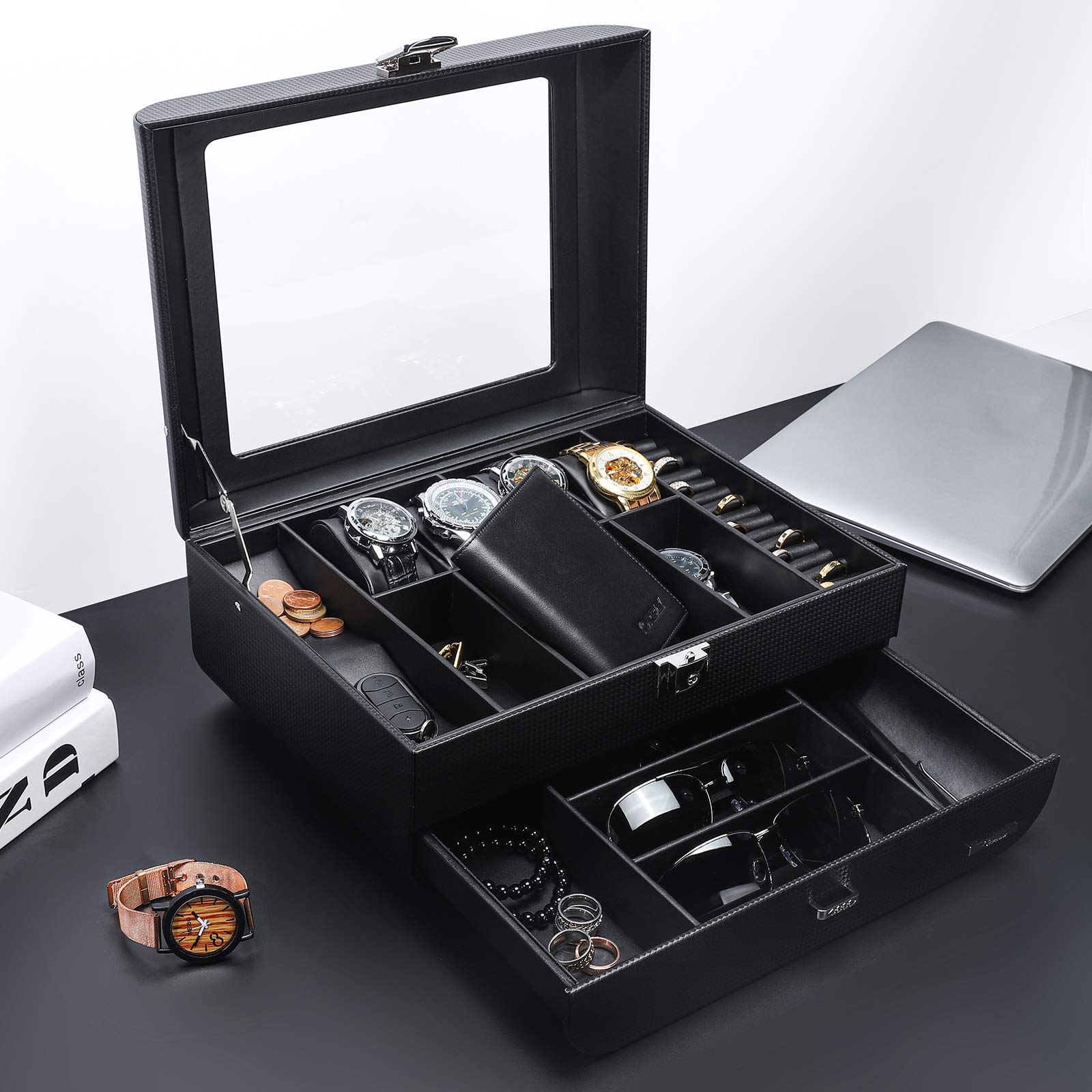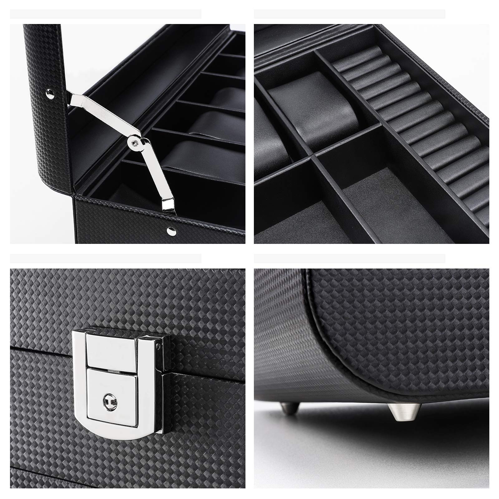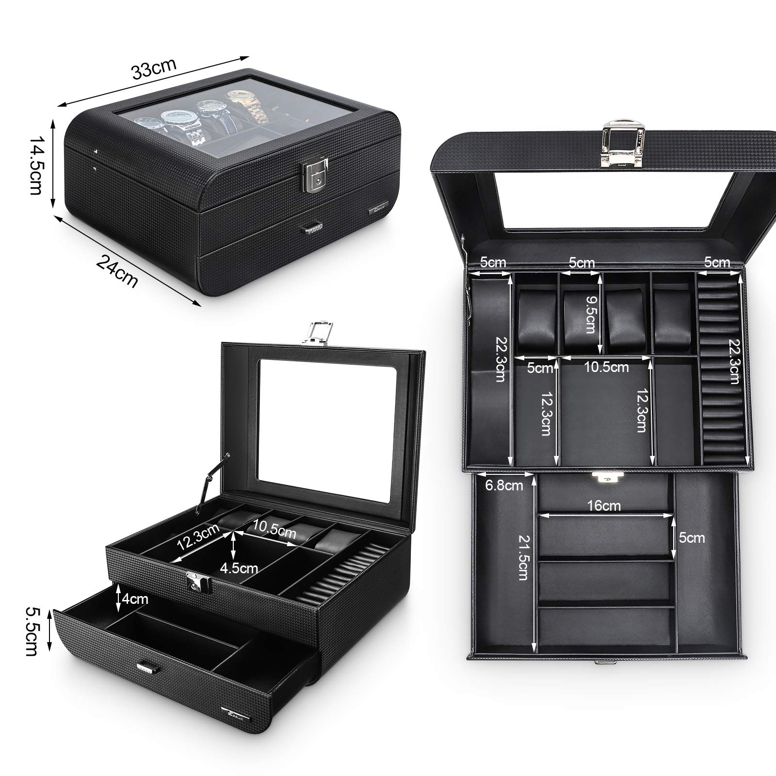 "Fashionable design: The elegant watch box impresses with a simple design, charming aesthetics, and good craftsmanship. The combination of soft carbon fiber faux leather and high-quality lining with the large and transparent viewing window not only effectively protects your jewelry, but also presents it effectively.