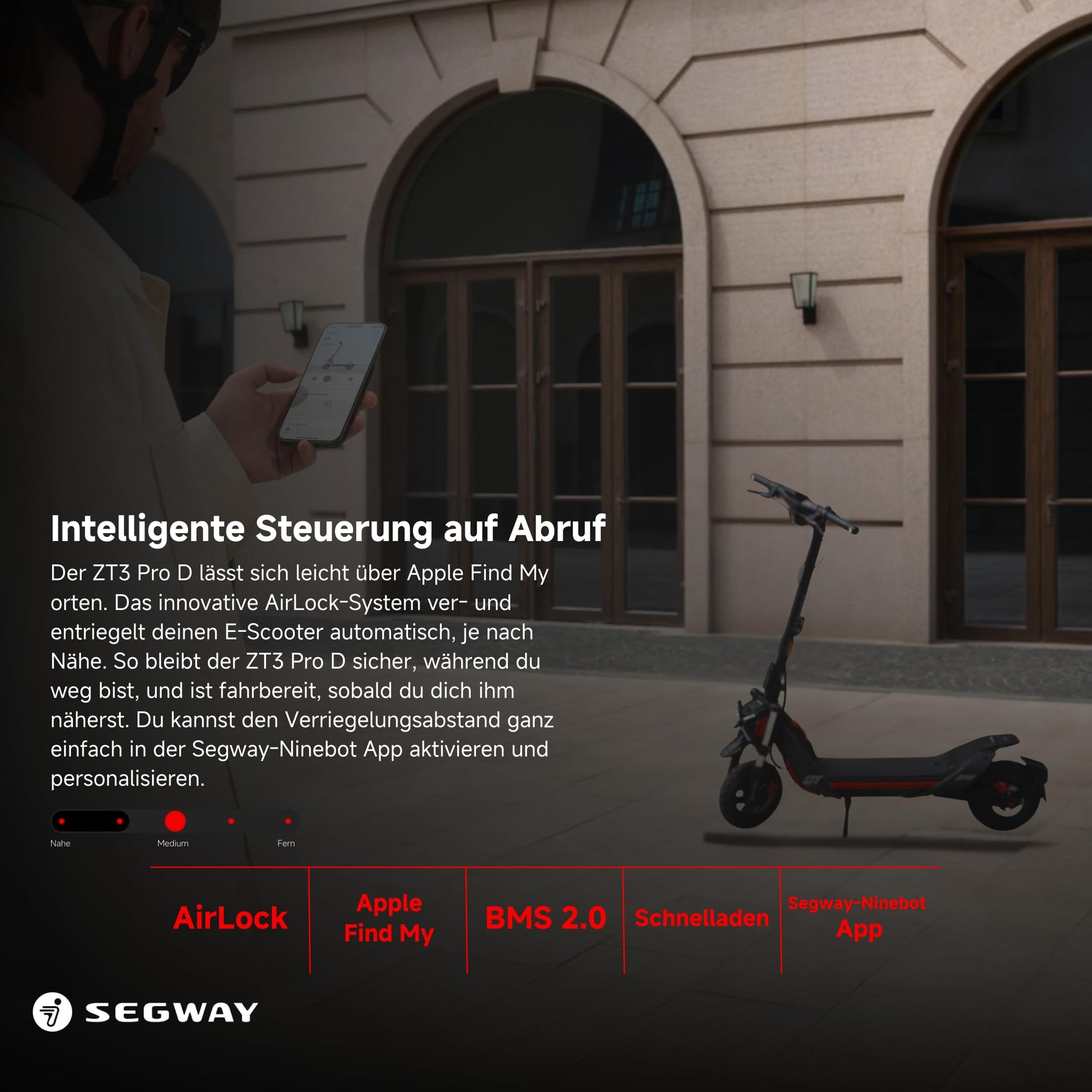 ["Strong range for every ride", "The E-Scooter offers an impressive range of up to 43 miles in Eco mode for efficient and economical riding. At maximum speed, it still reaches a range of 35 miles, making it ideal for commuting, city traffic, or extended tours. Enjoy long rides without frequent recharging.", "Comfortable driving experience, powerful performance, and high load capacity", "Experience a comfortable driving experience thanks to double telescopic front and rear wheel suspension and 11-inch tubeless off-road tires. With a maximum load capacity of 265 lbs, the E-Scooter is suitable for adults, commuters, and adventure enthusiasts. The powerful motor makes it ideal for off-road tours and urban rides. Enjoy a stable, comfortable, and powerful driving experience on any terrain, with safety as the top priority", "Efficient charging time", "The powerful lithium-ion battery only needs up to 4 hours for a full charge thanks to Flash Charge technology and is ready for your next ride. In addition, a quick 30-minute charge already provides a range of up to 6 miles in Eco mode, allowing you to be flexible and spontaneous on the go.", "Intelligent features", "The E-Scooter offers advanced features such as the Segway-Ninebot App, Apple Find My, AirLock, and a full-color LED dashboard. Monitor speed, battery status, energy consumption, and mileage conveniently through the display or app. The dashboard displays important information such as speed, battery level, driving mode, and Bluetooth connection. With the app, you can lock the scooter, analyze trip data, and adjust acceleration. Safety features like BMS 2.0, TCS, and Apple Find My ensure protection and safety during the ride", "E-Scooter with Offroad Character", "Thanks to the double front and rear wheel suspension, the scooter effortlessly handles uneven roads, rough paths, and challenging terrain. The Segride stability enhancement system combined with the Traction Control System (TCS) ensures optimal grip, reduced handlebar movements, and a safe ride, even in slippery or steep conditions."]