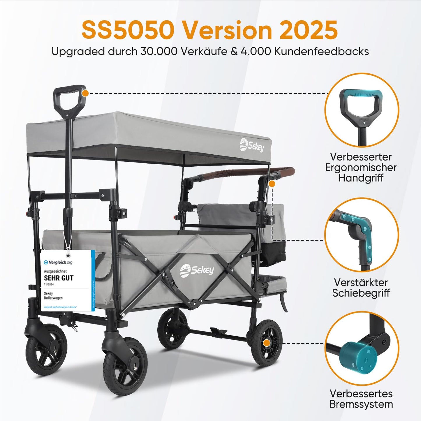 Sekey Folding Wagon with Canopy 2 Kids 220 lbs, Foldable Handcart with Push Handle, Stroller Shockproof PU Wheels with Brakes 110L, SS5050, Gray