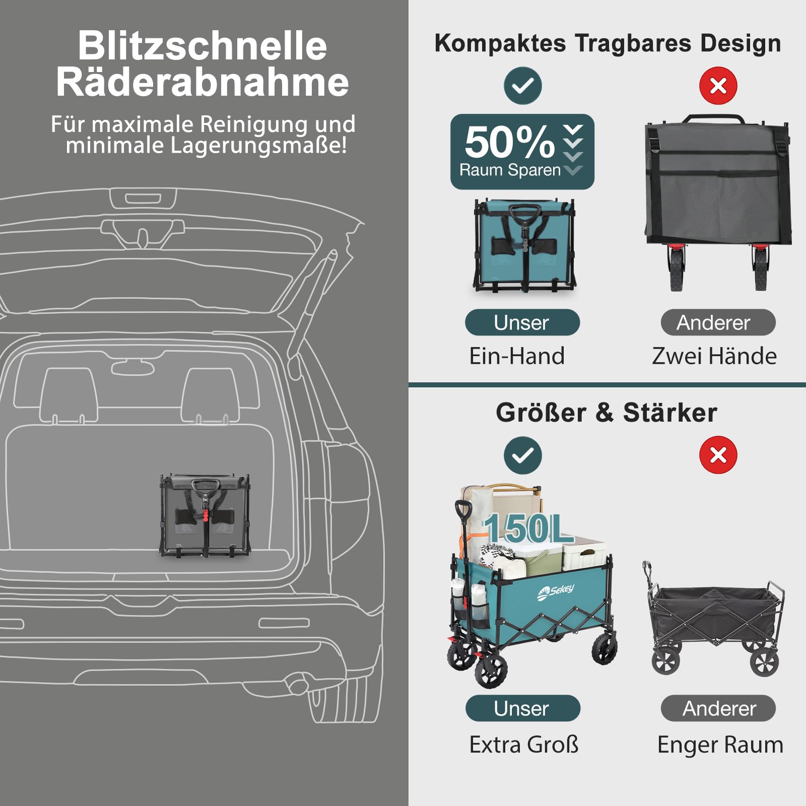 "Convenient Storage and Pristine Luggage: The detachable wheels allow for easy cleaning of the wagon, making it easier to transport the wagons without dirtying or muddying your storage space, for example in the car.",