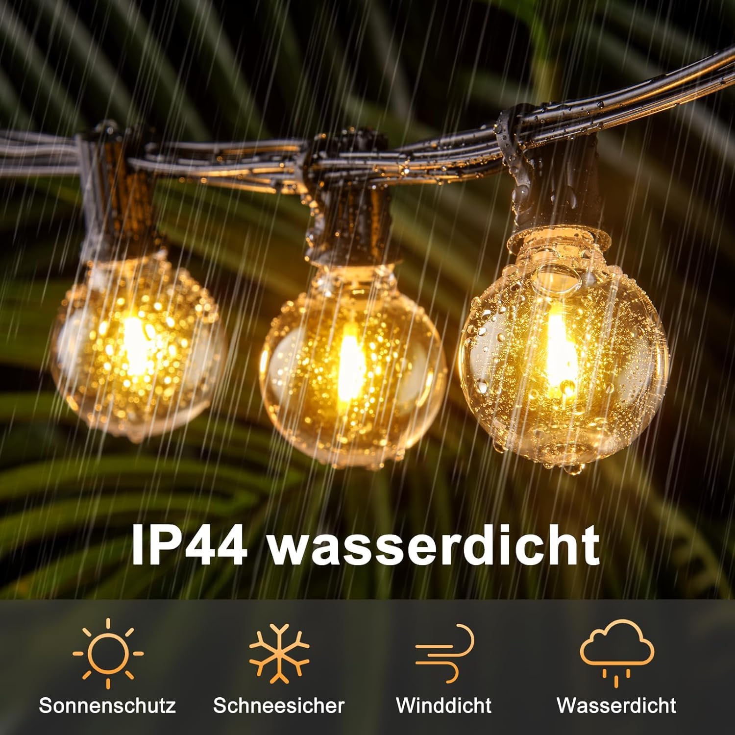 ["【Shatterproof and Waterproof】 The outdoor string lights are made of plastic bulbs with high light transmission, making them more shatterproof than traditional bulbs. Our led outdoor string lights with IP44 waterproof technology.","【0.2W Energy-saving Bulbs】 The outdoor string lights come with 50 pieces (with 2 replacements) of G40 LED bulbs. Each bulb has a power of 0.2 watts, with 2700K warm light and an energy-efficient rating. With a lifespan of over 30,000 hours, the balcony string lights can save over 90% on electricity and maintenance costs.","【Safe 24V Low Voltage】 Our outdoor string lights power supply operates on a 24V low voltage within a human safety voltage range and comes with a CE and UKCA certified EU plug. Ensure that the outdoor & indoor string lights are safe and reliable.","【Easy Installation】 Each outdoor string light bulb has a hook for easy hanging, allowing the outdoor string lights power to be easily secured with cable ties or ropes, and you can customize the garden string lights by hanging them around trees to create unique shapes.","【Widely Used】 Garden string lights are versatile for outdoor and indoor use. The string light bulbs can create a cozy and romantic atmosphere for your gardens, patios, porches, balconies, gazebos, decks, backyards, tents, bedrooms, dining rooms, cafes, bars, etc.","【1-Year Warranty】 If you have any questions about our outdoor string lights, feel free to contact us. We will respond within 24 hours and also provide you with a one-year warranty. Please feel confident in placing your order."]