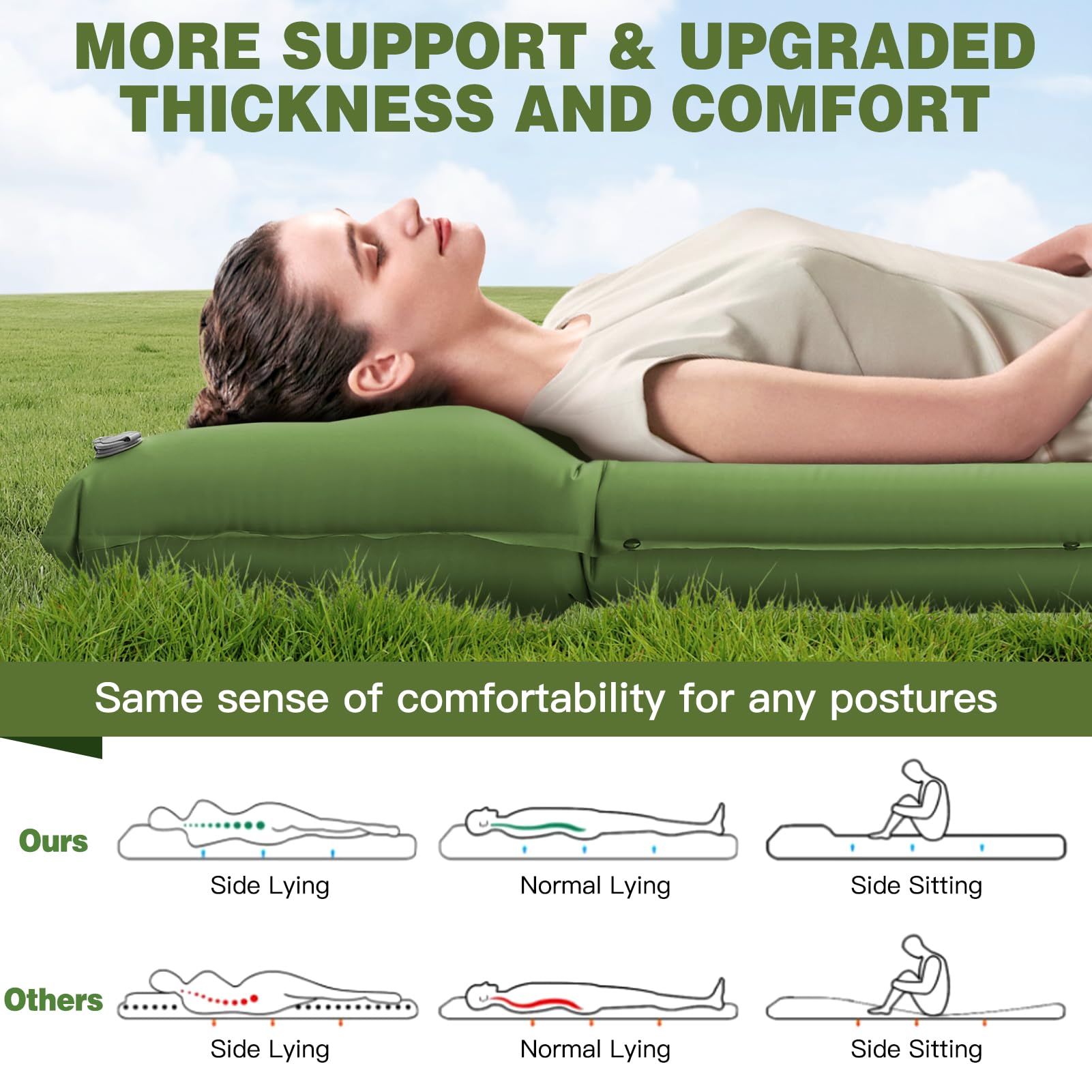 ["12CM ISOMAT THICKER AND MORE COMFORTABLE: Kiaitre air mattress features an I-Beam structure to enhance the thickness of the mattress, 4.7-4.7 inches thick when fully inflated, thicker than most camping mattresses on the market. Whether you lie on your back or on your side, you can keep your body completely away from the cold and rough ground, making you feel as comfortable as sleeping in your bed at home!","BUILT-IN FOOT PUMP: Save time inflating, no hands, no mouth, no air pump! The outdoor air mattress has a built-in foot pump that allows you to fully inflate the inflatable air mattress within 60-90 seconds by stepping on it with your feet, which is convenient and practical. Deflating a camping air mattress is easy: simply open two valves to release the air from the camping mattress.","EXCELLENT COMFORT & SUPER SUPPORT: The self-inflating air mattress is made of thickened 40D nylon and TPU composite material, which is waterproof, tear-resistant, and skin-friendly, with a maximum load capacity of 500 kg. This self-inflating mattress also performs better under harsh conditions, providing excellent support to help you say goodbye to the inconveniences during your travels, ensuring a pleasant night and optimal sleep comfort.","ULTRALIGHT AND COMPACT: The Kiaitre camping air mattress has an open size of 77.2 x 28.3 x 4.7 inches, folded size: 11 x 5.5 x 3.9 inches. The package weighs only 2.2 lbs. This self-inflating air mattress is very compact, making it ideal for outdoor activities such as camping, backpacking, hiking, and the beach.","MAKE A DOUBLE BED: The Kiaitre camping air mattress features buttons on both sides, allowing you to easily connect one air mattress to another to transform it into a double bed. It is the best self-inflating sleeping pad for camping with family and friends."]