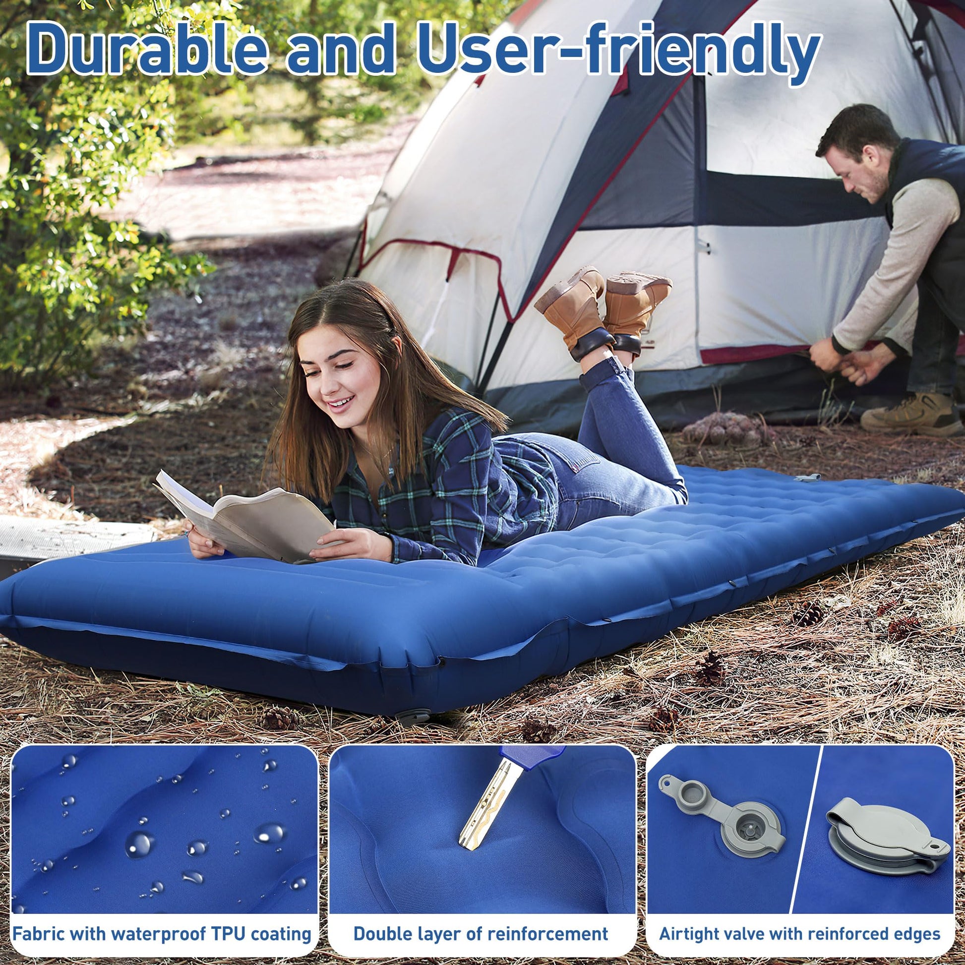 ["HIGH-QUALITY THICKENED INFLATABLE MATTRESS: This self-inflating air mattress has a super thick of 4.7 inches, which can prevent back pain from hard stones on the ground. The high-quality 40D nylon fabric is waterproof, tear-resistant, and wear-resistant. Combined with the TPU coating, it enhances the performance of the self-inflating air mattress in rough outdoor conditions and ensures a comfortable sleep.","PREVENT AIR LEAKAGE: The side seams of the outdoor sleeping pad are made of careful sealing lamination technology. The upgraded air valve with double-layer design can prevent gas leakage. Whether sitting, lying, or sideways, your camping mattress won't collapse, holding a maximum load of 459 lbs.","LIGHTWEIGHT AND EASY TO CARRY: The widened 77.2 x 26 x 4.7 inch ultralight sleeping pad can comfortably accommodate a European adult lying down. After deflating, the air mattress folds into a compact package of only 11.8 x 6.7 x 4.5 inches and weighs 2.02 lbs. It is very convenient to carry during outdoor activities and can be placed on the side of a backpack, reducing your burden and making camping more relaxed.","QUICK INFLATION, SAVE WORRIES AND EFFORT: Are you still blowing up with your mouth or using an air pump? The camping air mattress features a foot-operated air pillow that is easily inflated by stepping on it. The double-layer air plug allows for quick deflation by pulling out the plug, so you can pack up the sleeping pad and start a new journey.","MULTIFUNCTIONAL WITH SIDE BUCKLE DESIGN: The camping air pillow has buttons on the edge. Two single air mattresses can be joined together to form a double mattress, perfect for traveling with your family and friends. If you have any questions, feel free to contact us. We will solve your problem within 24 hours."]