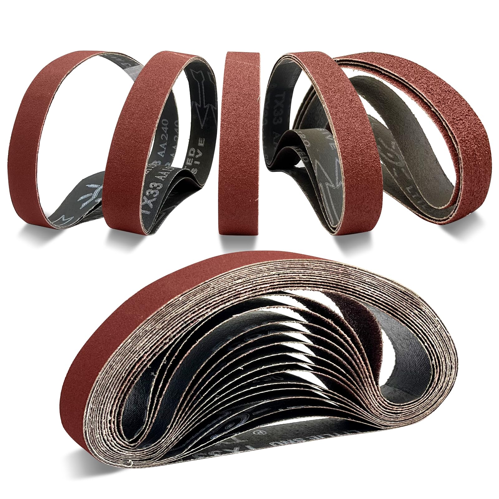Set of 15 Sanding Belts: 30 X 533 mm sanding belt with 5 different grits 40 80 120 150 240, 3 belts per grit size; The sanding belts range from coarse to fine, for most of your sanding and polishing needs.