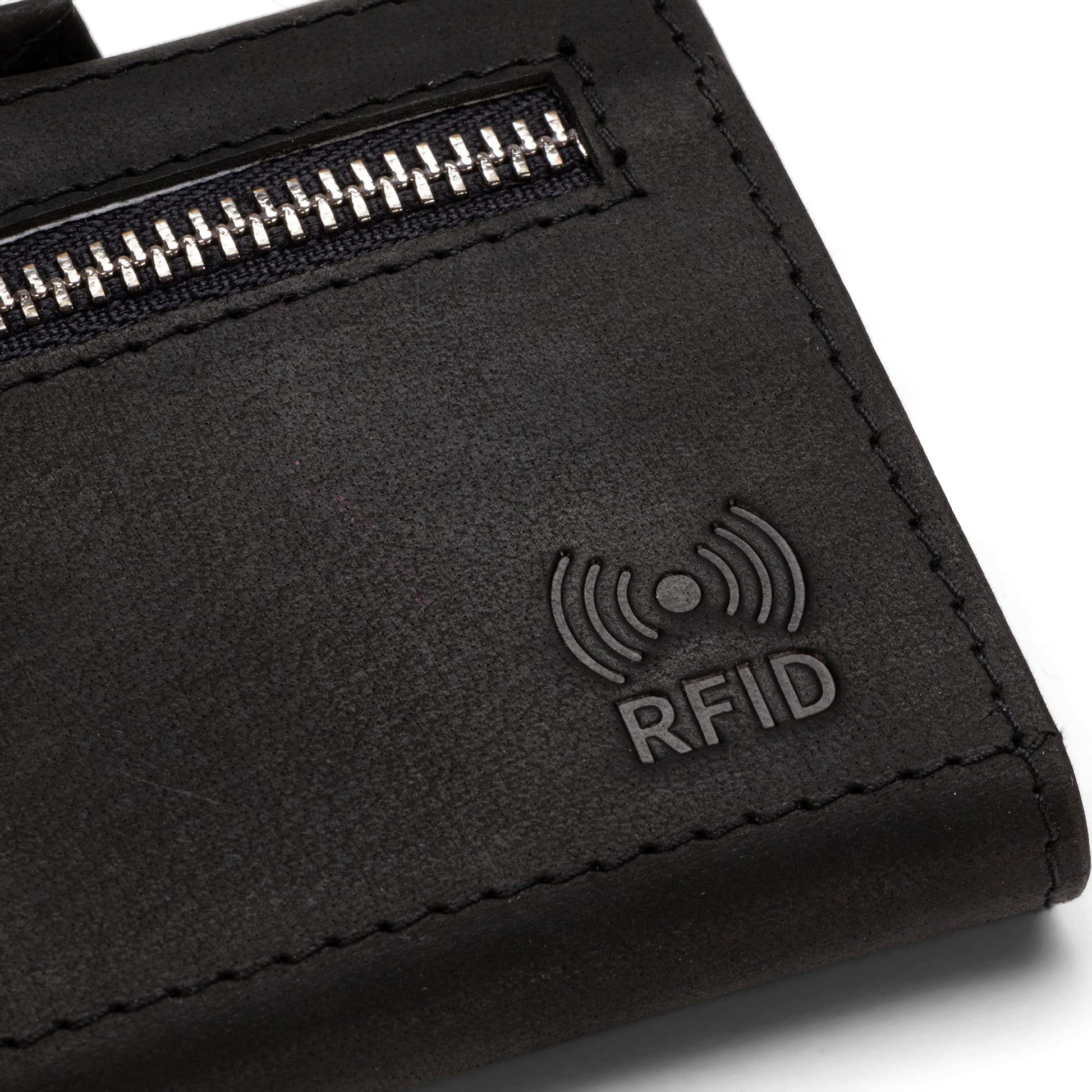 ["RFID PROTECTION - Your black men's wallet for everyday use. The signal-blocking lining also protects it from data theft by RFID / NFC readers","GIFT IDEA - Want to give the men's wallet as a gift? We make it easy for you! You will receive a pretty gift box with your men's wallet to showcase it perfectly","ORGANIZATION - 7 card slots (with photo slot), 1 bill compartment, and 1 zippered coin pocket. Measuring 9cm long x 7cm wide x 1.8cm thin, the men's leather wallet comfortably fits in any pocket","GENUINE LEATHER - Only high-quality cowhide leather is used for your men's wallet. Its craftsmanship will ensure this elegant men's wallet accompanies you for a long time, in everyday life and during travels","QUALITY - Simply put: You are 100% satisfied with your men's wallet or money back. Click 'Add to Cart' now and treat yourself or your loved ones!"]
