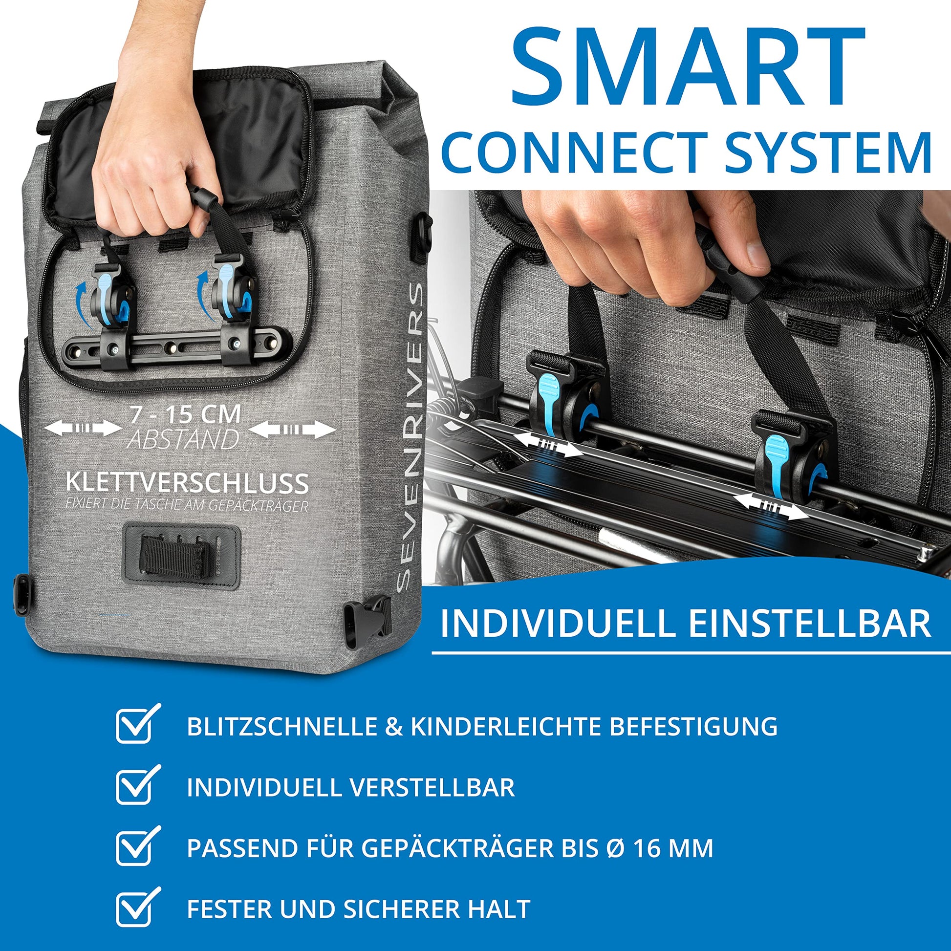 "SMART-CONNECT-SYSTEM - The sophisticated Smart-Connect system allows you to quickly attach and detach the bike bag to the luggage rack. Thanks to its individual adjustability, it fits almost any luggage rack (even e-bikes). Even on bumpy rides, you don't have to worry, the bag holds securely to the luggage rack.",