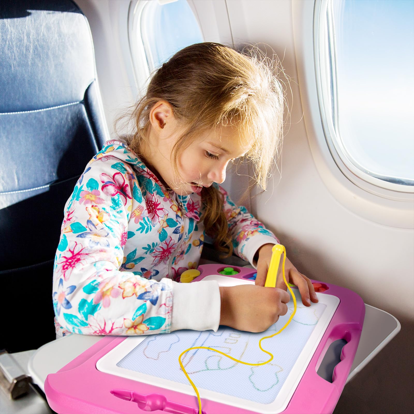 ["Large Drawing Area: The drawing area of the magic slate is up to 10.2*7.9 inches, providing young children with plenty of space to express their artistic imagination on the enhanced magnetic board with vibrant and smooth lines.","Stamps Don't Lose: The improved stamps are magnetized to easily stay connected to the drawing board. Your child can carry the board anywhere without losing stamps.","Gift for Preschooler: Your toddlers can express their own ideas in drawings, practice letters and arithmetic through doodles. It is an ideal toy gift for your preschool-age children!","Easy to Erase: The improved slide eraser is made larger and smoother, allowing children to gently slide and erase their drawings. The eraser also comes in a cute and ergonomic shape for easy grip.","Safe to Play: This Magnetic Drawing Board is made with high-quality ABS and PS plastic construction, which is BPA-free and safe for your children. Additionally, the magic drawing board is equipped with rounded edges and a curved pen tip to protect your child from potential injuries."]
