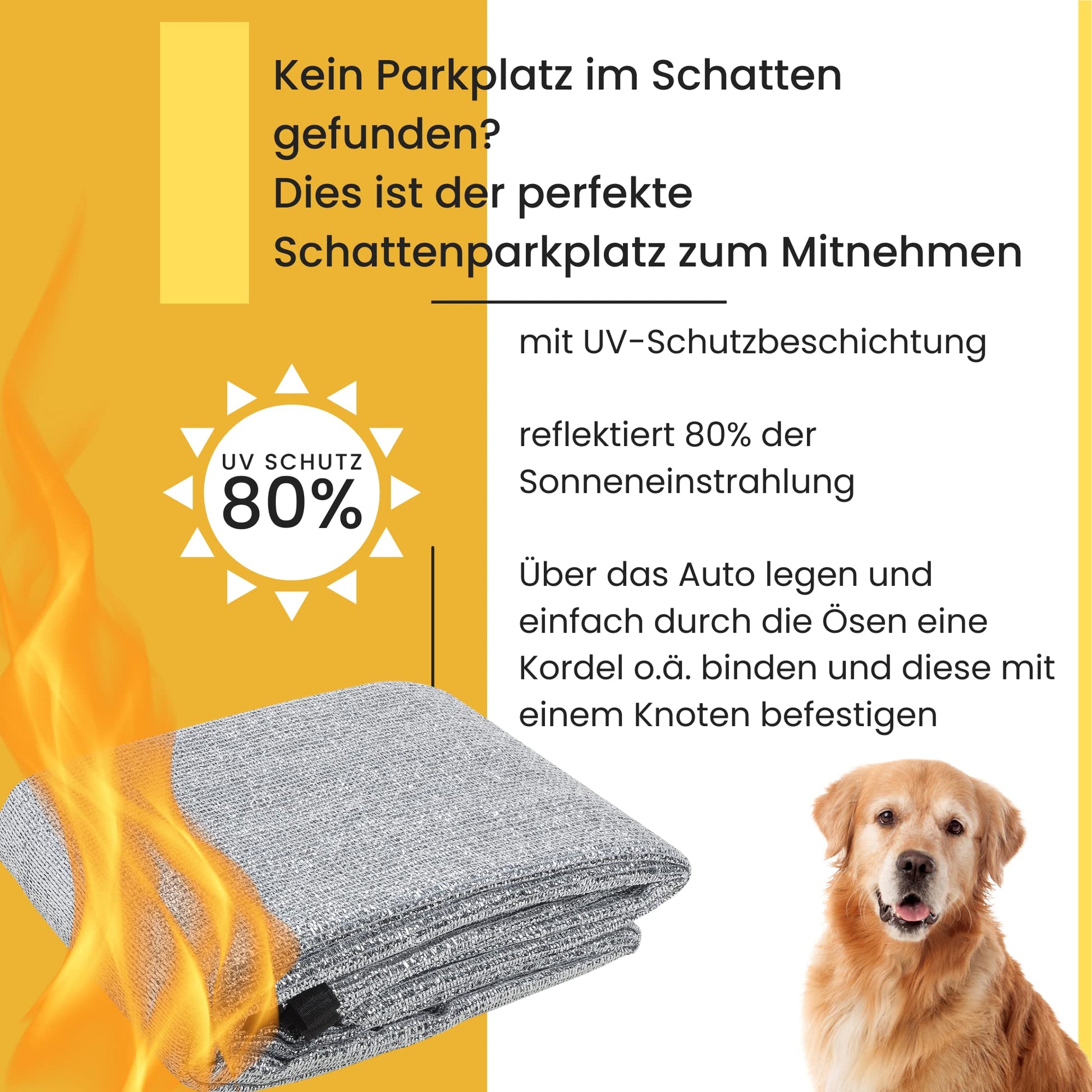 "Perfect shade parking: The premium shade tarp with eyelets is the portable aluminum heat protection for cars - ideal as a shade net for camping, for transport boxes, motorhomes, aviaries, or in the garden."