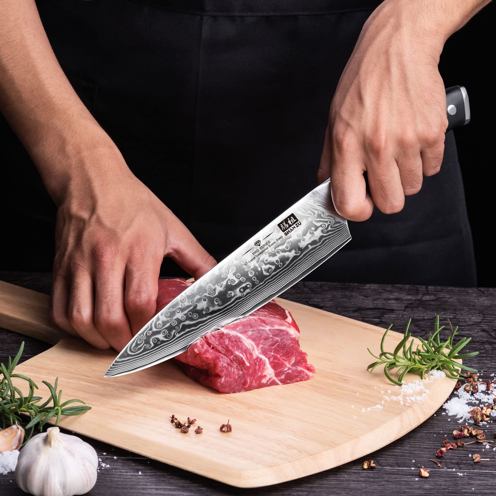 ["【Japanese Steel Core, super sharp】SHAN ZU Chef's Knife core adopts 10Cr15MoV Japanese Damascus steel, high hardness (62HRC), corrosion resistance and wear resistance; Combined with advanced modern forging technology, you get an ultra sharp kitchen knife","【REAL Damascus Knife, Not Laser Etched】Damascus knives are famous for their beautiful pattern. The Damascus knife by SHAN ZU creates a blade pattern through repeated folding and forging of multiple layers of carbon steel sheets, and the pattern becomes more visible after polishing. Fake Damascus knives are only laser etched (surface treated) to create a pattern, and it disappears completely after polishing","【Forged with 67 Layers of Steel Plate, durable】The core of the SHAN ZU Damascus knife is made of Japanese 10Cr15MoV steel. In addition to the steel core, the blade is forged from 66 layers of carbon steel. An overall 67-layer steel structure significantly enhances corrosion resistance, rust resistance, toughness, and other properties, making it a durable all-purpose knife","【Comfortable and Solid G10 Handle】Features a matte Fiberglass G10 handle, stronger than a wooden handle, moisture-resistant and never deformable, ensuring long-lasting durability. The ergonomically shaped handle provides a comfortable grip and reduces fatigue","【Knife Details and Warranty】This chef's knife blade is 20cm long, 2.2mm thick, the handle is 13.5cm long, the cutting angle is 15 degrees. The knife weighs 270g. This SHAN ZU PRO Series Damascus knife comes with 2 years of enthusiastic customer service. If you encounter any problems, please contact us"]