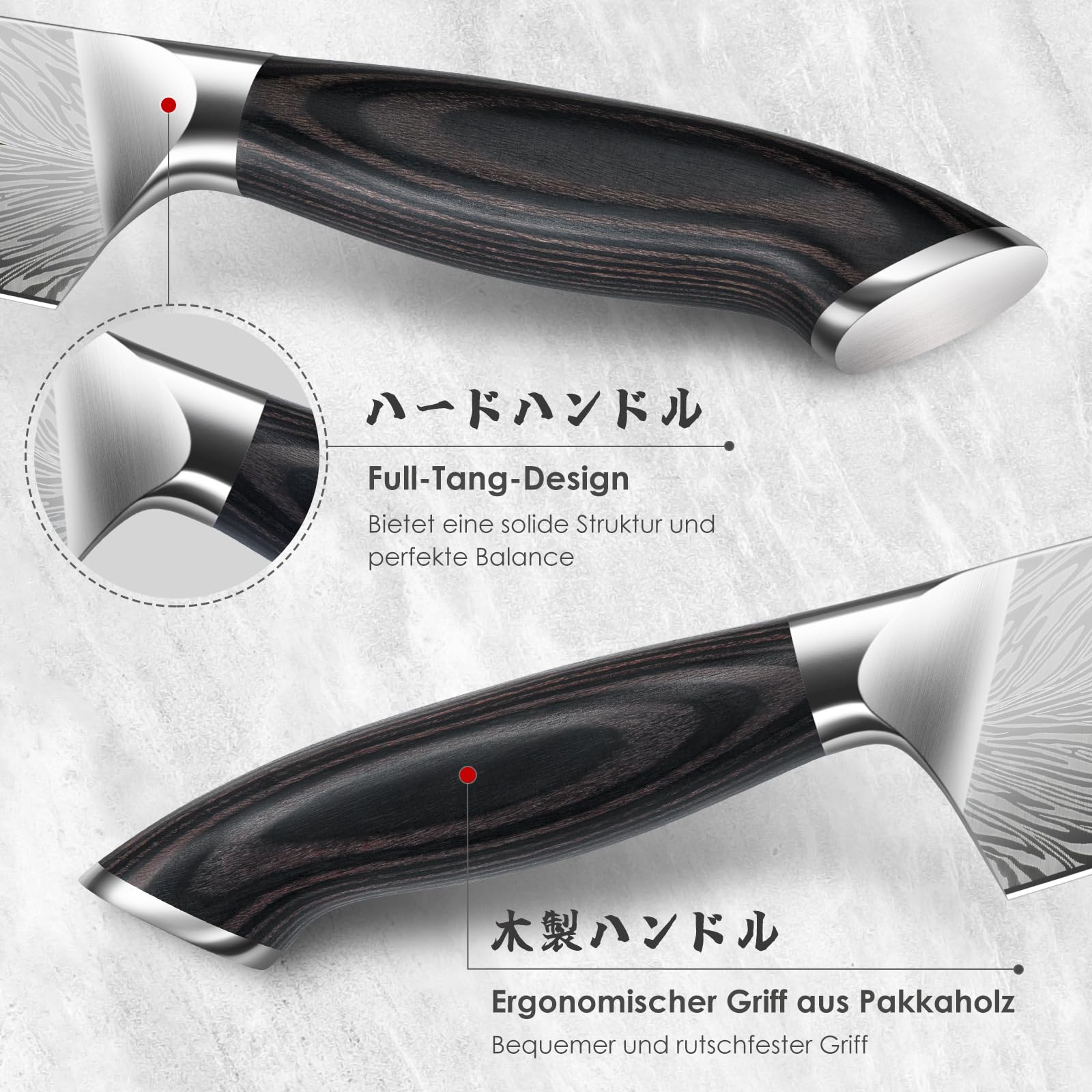 【Comfortable and Ergonomic Handle】This sharp knife, with a handle made of heat-resistant and moisture-resistant Pakka wood, is not prone to breaks or cracks. It is ergonomically designed to fit in your hands and provide you with a non-slip and secure grip. Consequently, it can alleviate the fatigue, numbness, and pain that arise from prolonged holding.