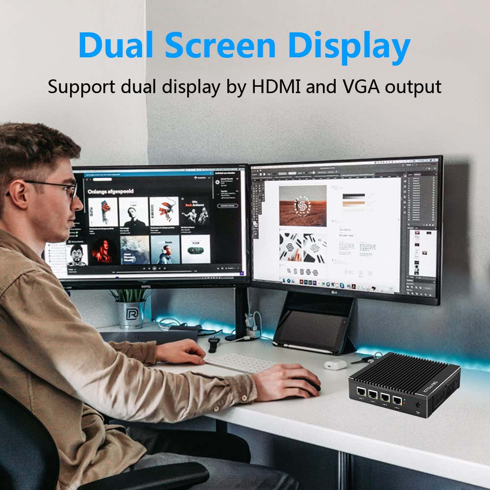 ["【Processor & Operating System】Fanless mini PC with Intel Celeron J4125 processor, 4 cores / 4 threads (up to 2.70 GHz), UHD graphics, CPU more powerful than N3700, suitable for various scenarios such as office, home entertainment, network security. Firewall PC supports other open-source systems. The i225 network card does not support Sophos, Vmware esxi, xcp ng, and entangle.","RAM and Storage: The Firewall Micro Appliance PC is equipped with 8 GB DDR4 SODIMM RAM, supports up to 16 GB maximum; 128 GB mSATA SSD, can be up to 512 GB. The large storage can meet the hardware requirements of various network security firewall software and hypervisor applications.","【Rich I/O Ports】The Firewall Mini Computer features 4 individual Intel 2.5 GbE i225 Gigabit ports, 2 x USB 3.0 ports, 1 x VGA port, 1 x HDMI port, 1 x DC port, it can connect various external devices such as TV, printer, projector, server, and surveillance devices. It can also be used as a web server, LAN or WAN router, VPN device, DHCP server, DNS server, and IDS/IPS.","【Compact & Fanless】The small firewall box is only 13.4 x 12.6 x 3.6 cm, small but powerful. Low power consumption, only 6W; fanless heat dissipation design, aluminum alloy housing, efficient and fast heat dissipation, supports 7x24 hours work, no noise. Equipped with VESA mount, you can save space by installing the micro PC behind the monitor.","Accessories and After-Sales: 1 x Mini PC, 1 x power adapter, 1 x power cord, mounting screws, 1 x user manual (possibly not in German), 1 x QC card. This product comes with a 12-month warranty, if you have any problems, please contact us through Amazon, we have a professional and efficient sales team to serve you diligently.","Resolution: 3840 x 2160","Storage Capacity: 8.0","System RAM Type: DDR4 SDRAM"]