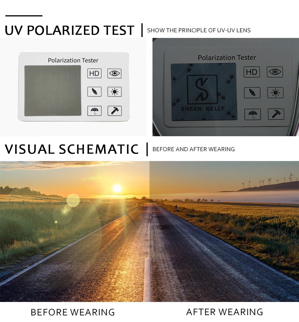 ["【POLARIZED LENSES】 SHEEN KELLY glasses can block 100% of UVA and UVB radiation. UV400 certified sunglasses are essential to protect your eyes from long-term UV damage and keep your eyes healthy when going out.","【HIGH-QUALITY HANDMADE ACETATE FRAME】 The temples are made of high-quality acetate fiber material, which has strong pressure resistance and is not easily damaged. At the same time, this glasses are handcrafted, making wearing the glasses more comfortable and secure.","【COMFORTABLE TO WEAR】 The high-quality material brings sweet looks, suitable for women and men, lightweight, comfortable fit, super durability, the sunglasses fit any face. Wearing sunglasses has never been so relaxing, safe, and comfortable as it is NOW!","【High-End Gift Box Packaging】 Special gift In a special season, you always hope to find a special gift for your beloved family and friends. Sheen Kelly has prepared a set of exquisite gift boxes for you. It is very suitable as a gift to others. You will receive a PU glasses case, glasses cloth, brand card, small gift card, red gift box, cloth, brand card, red exquisite gift box package.","【Quality Assurance】 Known brand casting experience, quality assurance, 30 days warranty. If a defective problem occurs, do not hesitate to contact SHEEN KELLY seller to solve the problem to your satisfaction. You take no risk and we offer you the best service!"]