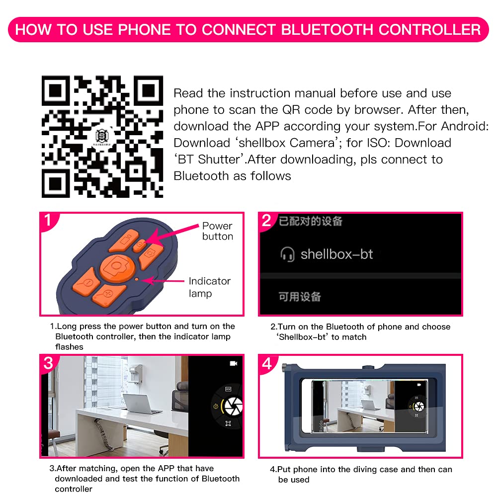 ["Bluetooth Remote Control: Waterproof smartphone case, Bluetooth remote control technology, faster Bluetooth connection and more stable signal. It is more convenient for you to shoot freely in the water.", "Wide Compatibility: Waterproof case for smartphones under 7 inches, compatible with most smartphones, including iPhone, Samsung, Huawei, Google, OnePlus, Xiaomi, Redmi, Motorola, LG, OPPO, Vivo, etc. Please refer to the detailed description of compatible phone models.", "Robust, strong, and waterproof - The diving case is small and 50 feet waterproof for 1-2 hours for a long time, made of thick PET clear film and composite plastic, soft screen, but durable.", "Built-in Camera Tripod Mount: It has a 1/4 screw hole and can be attached to professional photo accessories such as monopod, tripod, or stabilizer. With a shoulder strap for easy carrying.", "Secure Design: fully sealed 3rd generation waterproof phone case without blind spots, 360-degree protection for your phone. This waterproof case works well to capture clear and high-resolution images underwater."]