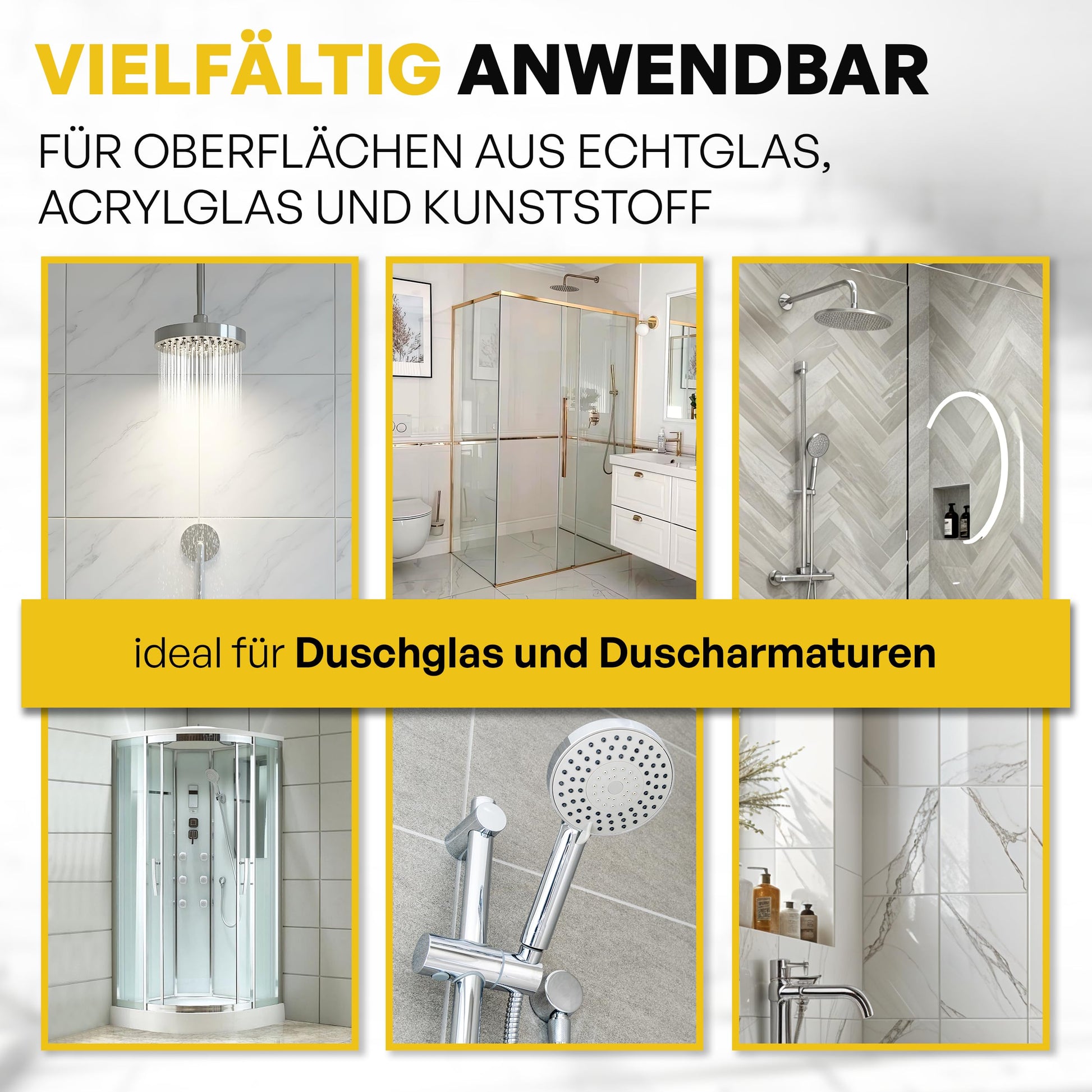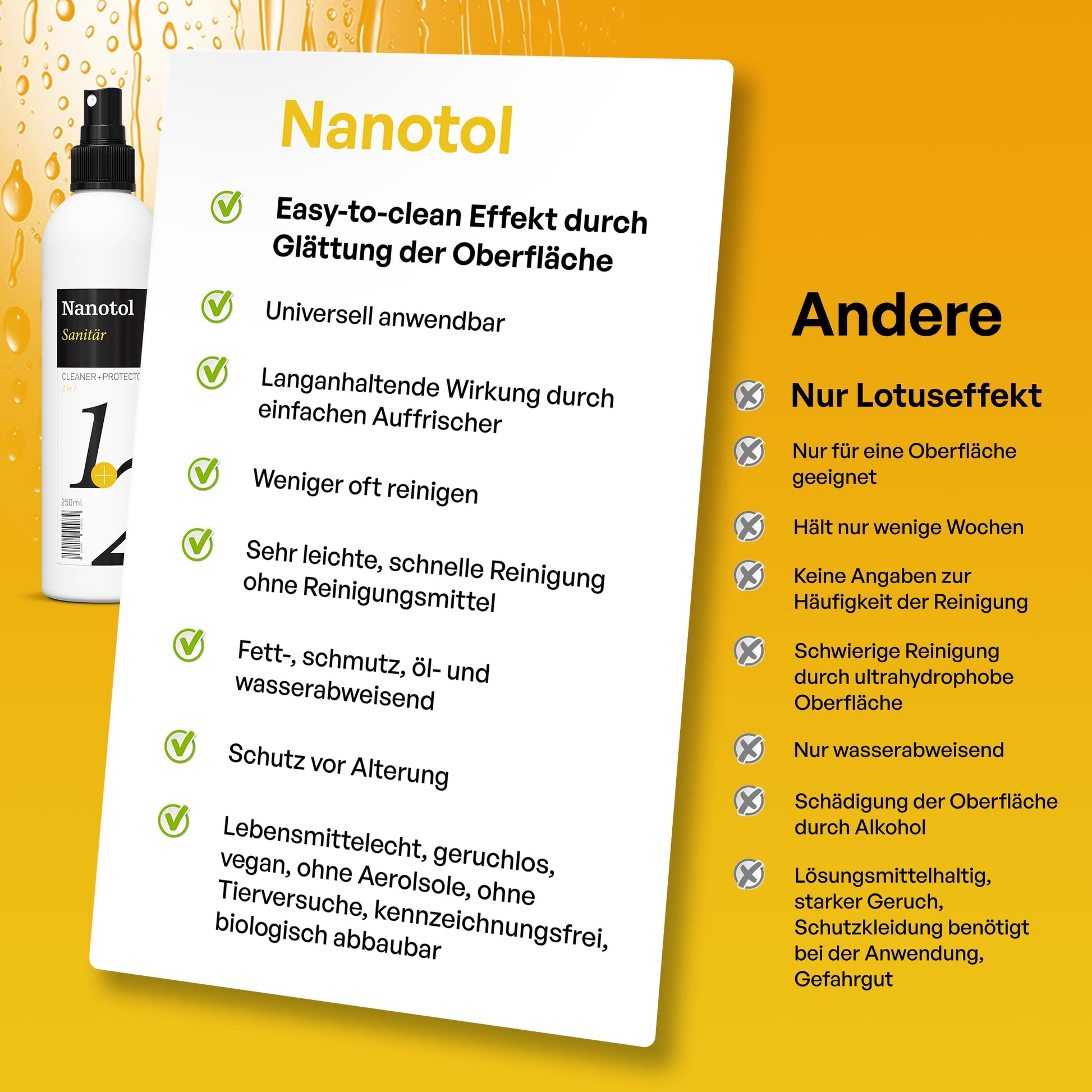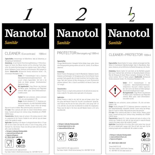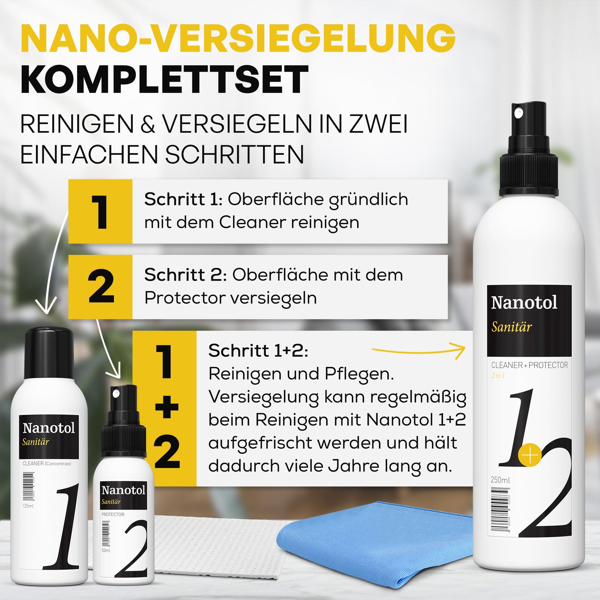["Nano sealing set for the basic sealing of a shower cabin: Cleaner for longer - faster - fewer limescale stains (including Nanotol 1+2 for easy refreshing of the seal as needed). Sufficient for approx. 8 m² surface of real glass, acrylic glass, plastic. Also suitable and effective on fittings.","Nanotol prevents limescale and dirt from firmly adhering. While conventional sanitary cleaners only clean temporarily, a seal with Nanotol provides long-term effective protection against limescale and water stains. The nanopolymers from Nanotol sit in the tiny pores of the surface and noticeably smooth it. This results in a rejection of water, limescale, and dirt and an easy and quick cleaning when needed.","1 - Nanotol Sanitary Cleaner: In order for the tiny nanopolymers to penetrate into the pores of the surface, it is important that they are clean and free of limescale. Nanotol Sanitary Cleaner cleans with high-quality, non-ionic surfactants and gently and thoroughly removes limescale. The cleaner prepares shower glass, ceramic sinks, fittings, or tiles optimally for the Nanotol Protector.","2 - Nanotol Sanitary Protector: After cleaning, the tiny nanopolymers can occupy and fill the pores. Nanotol Protector is thinly spread on the surface and polished with a microfiber cloth after drying. The nanoparticles are activated and the surface is immediately noticeably smoothed. Limescale and dirt can no longer firmly adhere from now on.","The effect of the seal can be refreshed regularly with Nanotol Sanitary 1+2 and thus lasts for many years. A re-application of the basic seal is then no longer necessary.","Nanotol is harmless and safe. The nano sealant is food-safe, environmentally friendly, invisible, odorless, UV-stable, biodegradable, temperature-resistant up to 200°C.","Important: When sealing a new shower cabin, please check if there is already a factory coating on the surfaces. If so, this can lead to impairments of the Nanotol seal."]