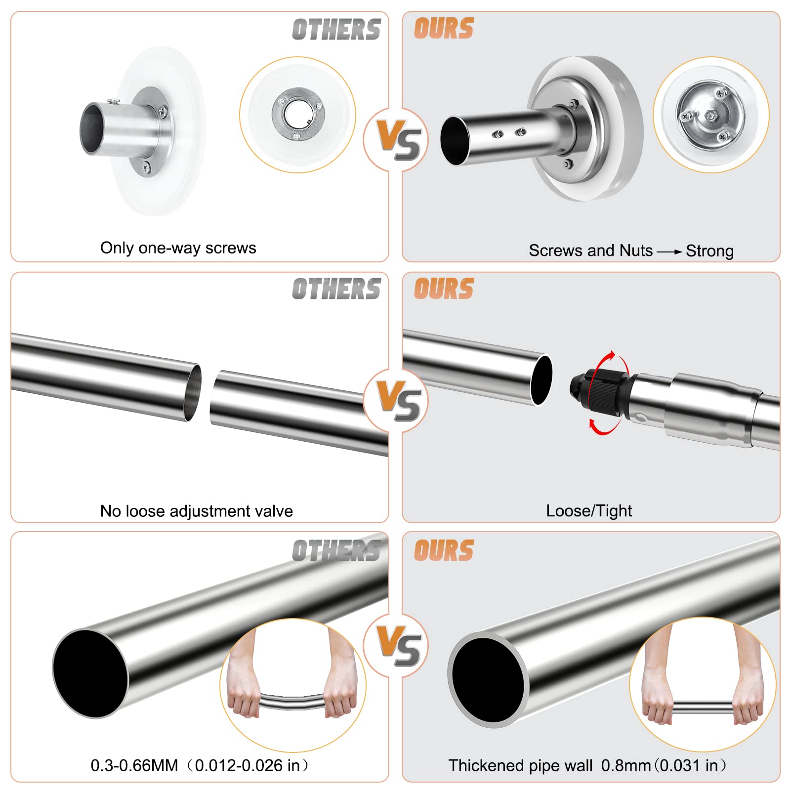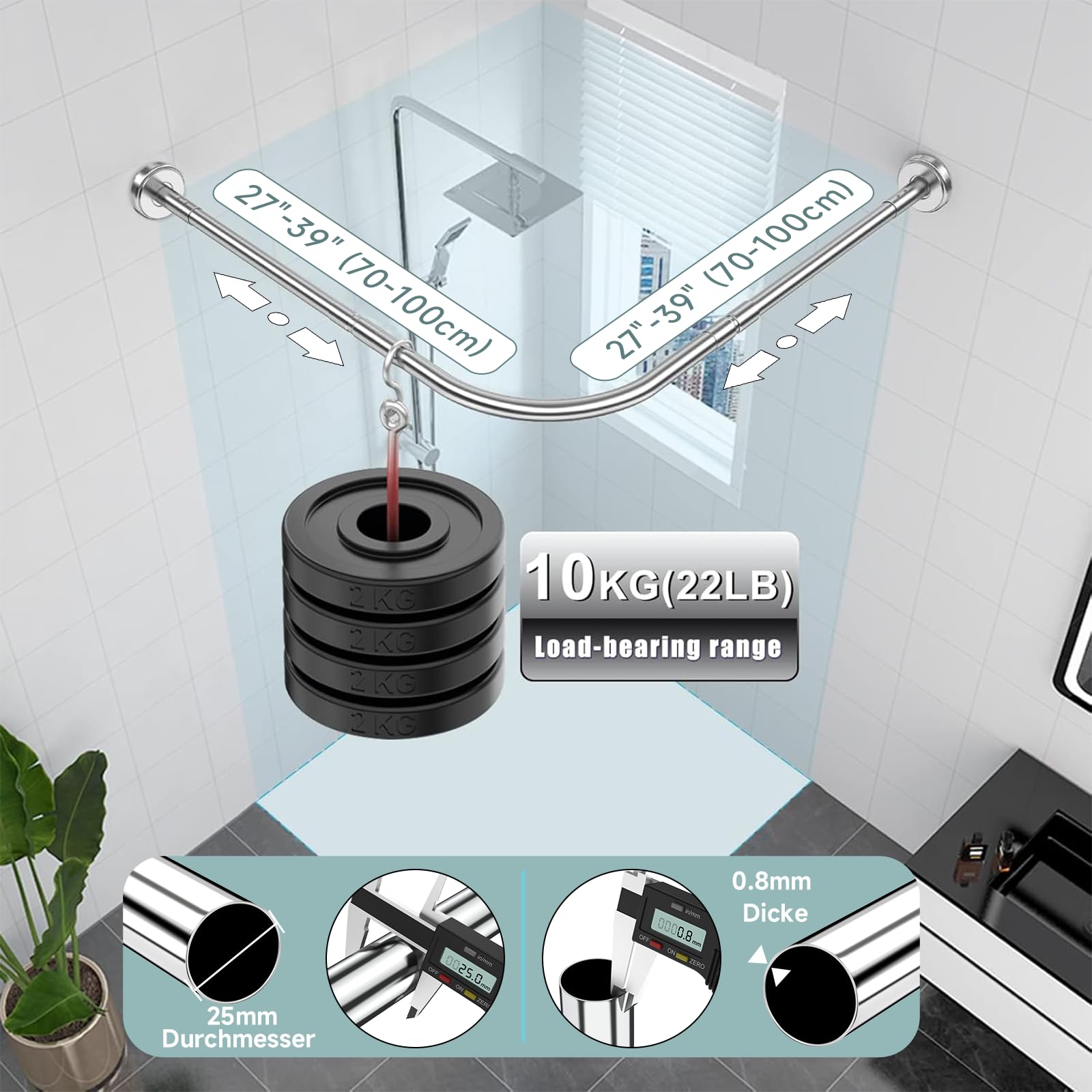 ["Adjustable L-shaped shower rod is made of high-quality 304 stainless steel (including accessories) to ensure quality and durability. With a polished chrome finish, shiny and smooth like a mirror, easy to clean, never rusts.",