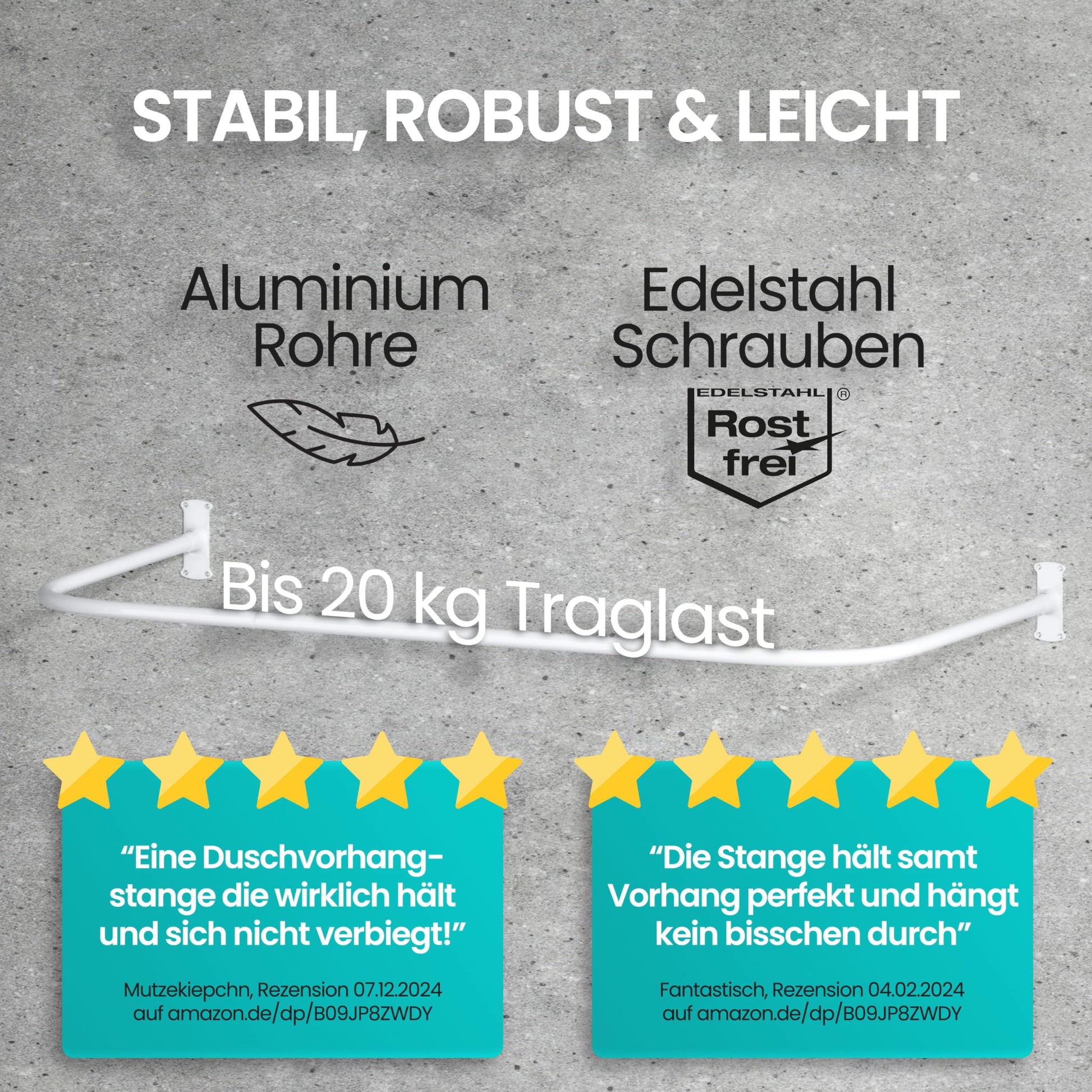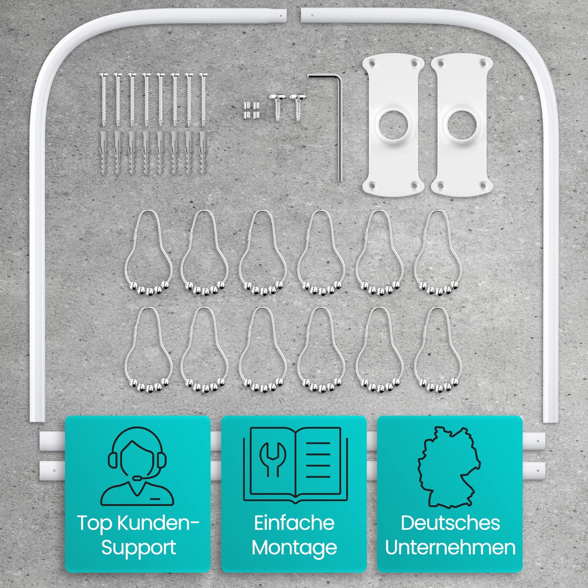 ["12 FREE RINGS INCLUDED - The shower rings float gracefully on the corner shower rod thanks to the gliding rollers, and the material and appearance are a perfect match. That's why we've decided to include the 12 shower curtain rings for free!","STABLE IN ANY SHAPE - The U-shaped and L-shaped shower curtain rod is extremely stable and lightweight thanks to the 4-fold screw-in brackets and aluminum rod - no annoying sagging or obstructing ceiling mount!","EASY AND FLEXIBLE - The 6 in 1 system allows for 100% flexible use for bathtub and shower. Installing the corner shower rod is child's play and can be done right away, even without the included installation manual!","RUSTPROOF MATERIAL - To permanently exclude rust 100%, the hanging hooks are made of stainless steel 201 and the L-shaped and U-shaped shower rods are made of aluminum. The white coating provides extra protection and a top appearance!","5 YEARS MONEY BACK - We are absolutely convinced of our Laakfeld shower curtain rod set, if you are not 100% satisfied, you will get your money back (extendable from 3 to 5 years, see product insert)!"]
