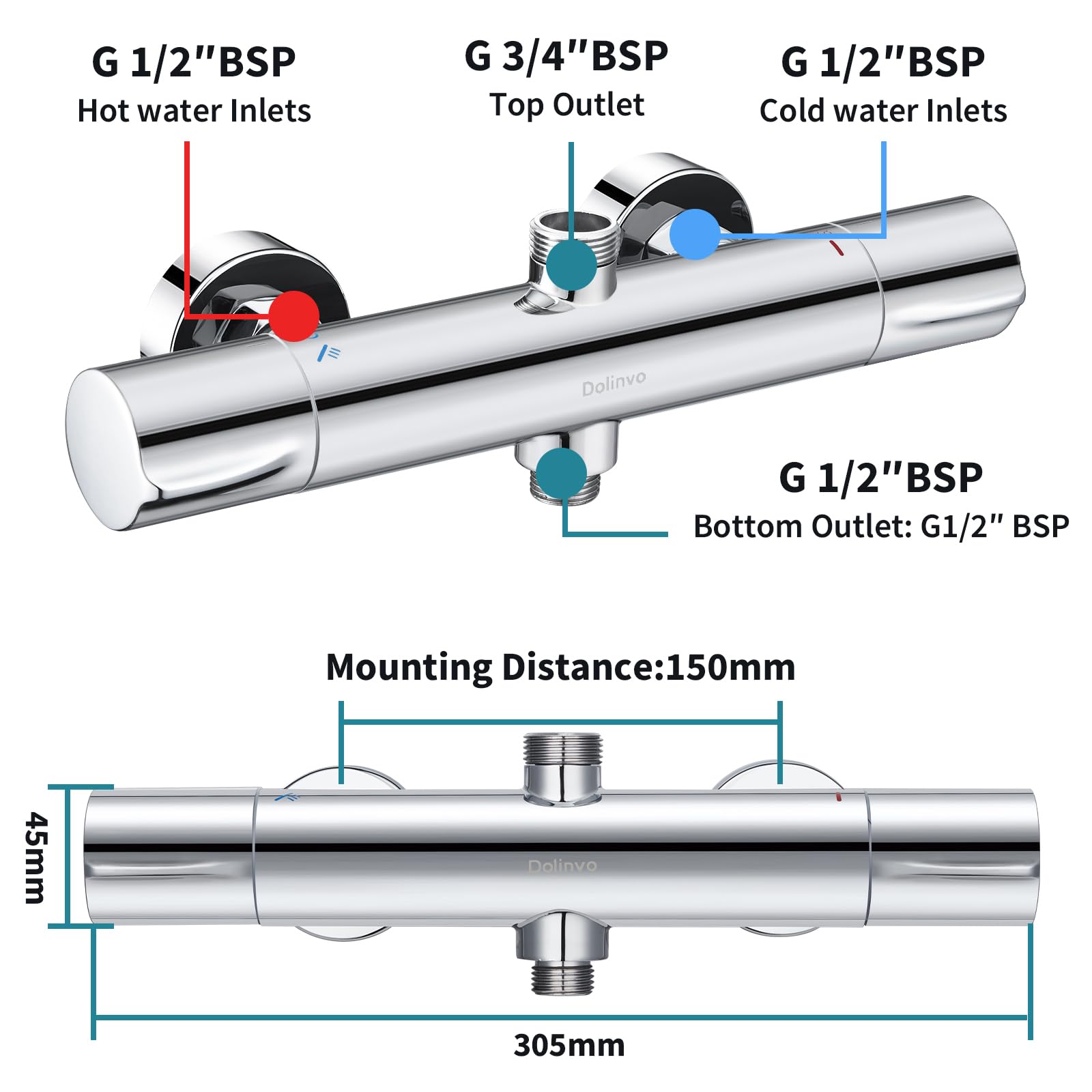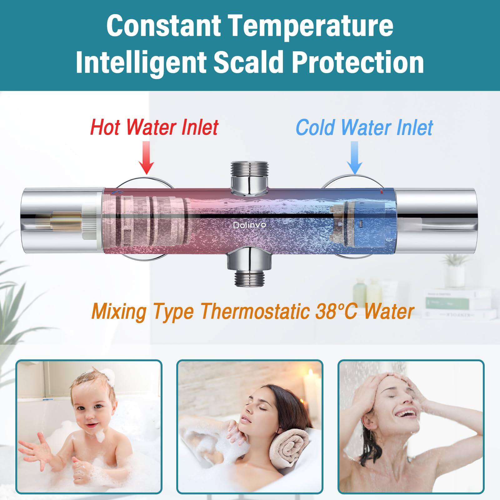 Shower Thermostat Mixer Tap Chrome, Dolinvo Shower Faucet Mixer with 38°C Safety Button & 2 Outlets, Round Shower Thermostat Mixer with Scald Protection & Water Saving Function