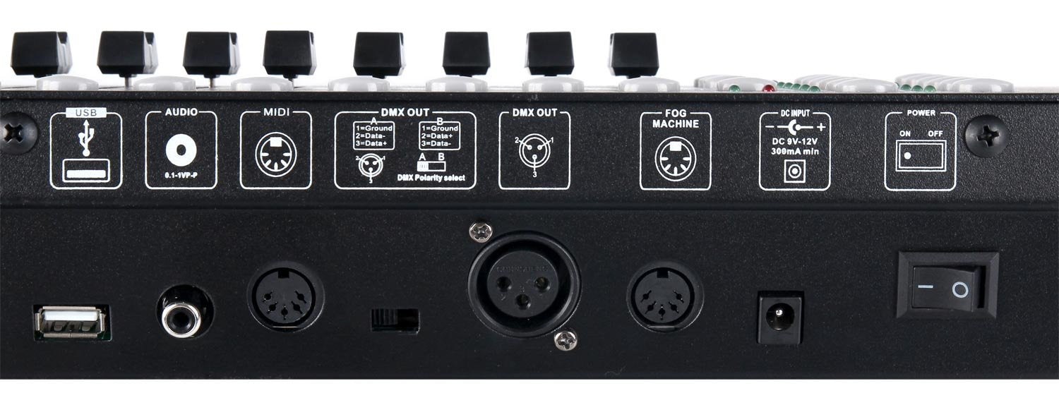 ["DMX controller, 192 DMX channels, USB connection for data storage on USB stick, up to 12 DMX-capable devices with max. 16 channels each, also controls LED devices","max. 240 scene memories (30 banks of 8 memory slots each), 6 programmable chasers, joystick for device control (tilt/pan), 8 channel faders with two pages (Page A: Ch. 1-8, Page B: Ch. 9-16)","2 faders for \"WaitTime\" and \"Fade Time\" control scene changes in chasers, display with 2x 8 characters, integrated control for fog machine, DMX output: 3-pin XLR","Midi input: 5-pin standard interface, USB connection: Type A, audio input: internal microphone or line input (RCA), power supply: DC 9V, 300 mA","19\"/3U, dimensions: 482 x 134 x 73 mm, weight: 1.5 kg, includes power supply and manual"]