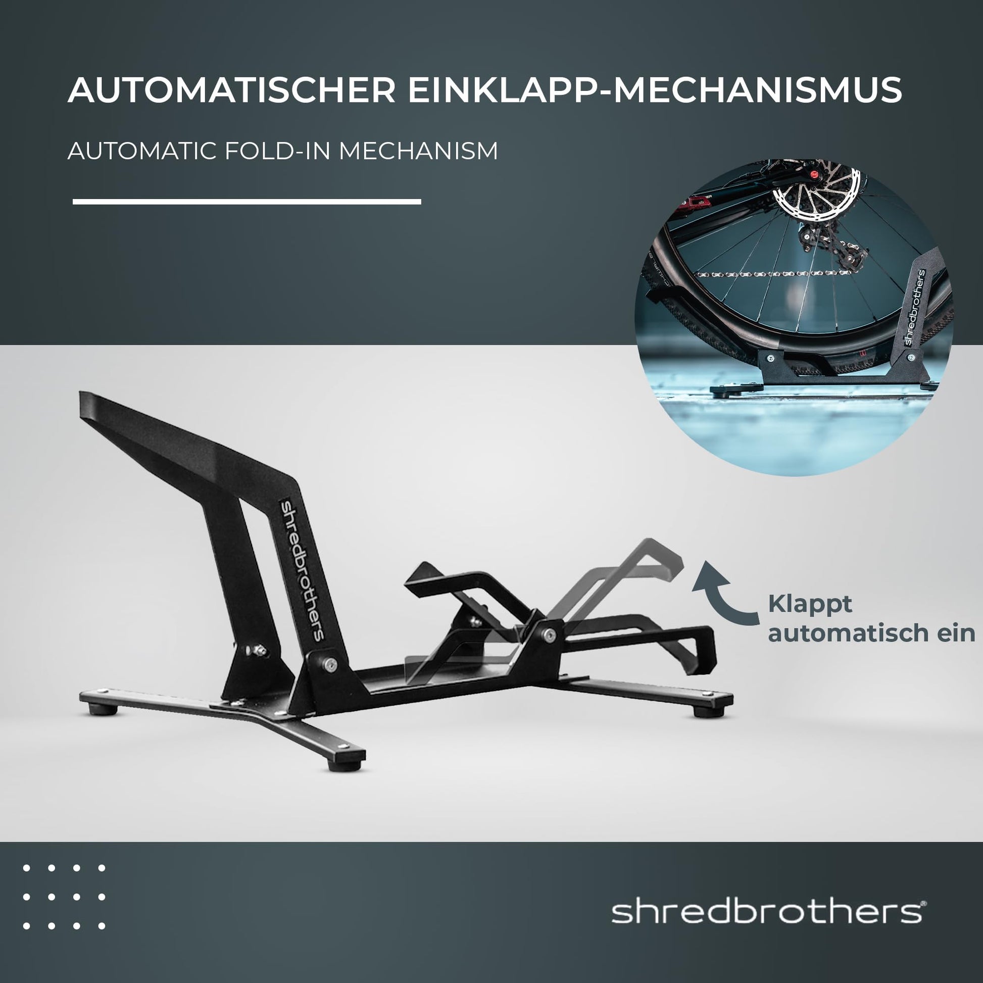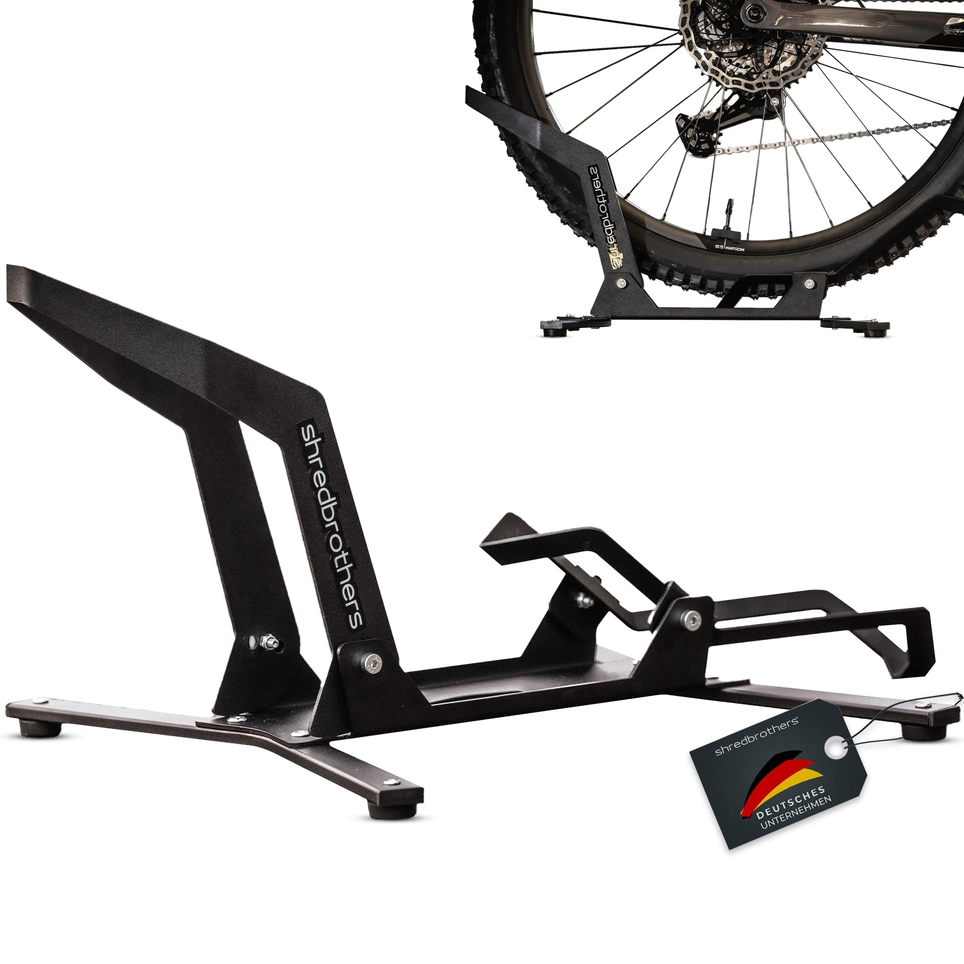 ["Shredbrothers Pro Stand Bike Stand Floor: innovative bike stand, where the front or rear wheel is fixed on a smooth rocker. Park in the stand in seconds and the bike stands stable","Bike stand space-saving and universal: easily adjustable from 26-29 inch wheel size, from 25mm – 3.0 inches, for e-bikes, road bikes, gravel bikes, MTB, e-MTB. Ideal as a presentation stand","Bike Stand - Engineered in Germany: sophisticated clamp mechanism for quick parking. Quickly adjustable (including tools). Non-slip rubber feet for stable support","Space-saving & stylishly designed: the bike stand only requires a footprint of 45cm width and is made of 3mm steel, powder-coated black. Load capacity: 40kg. Ideal for the home or garage","Scope of delivery: our space-saving bike parking stand is already partially pre-assembled. We provide the necessary tools for quick assembly"]