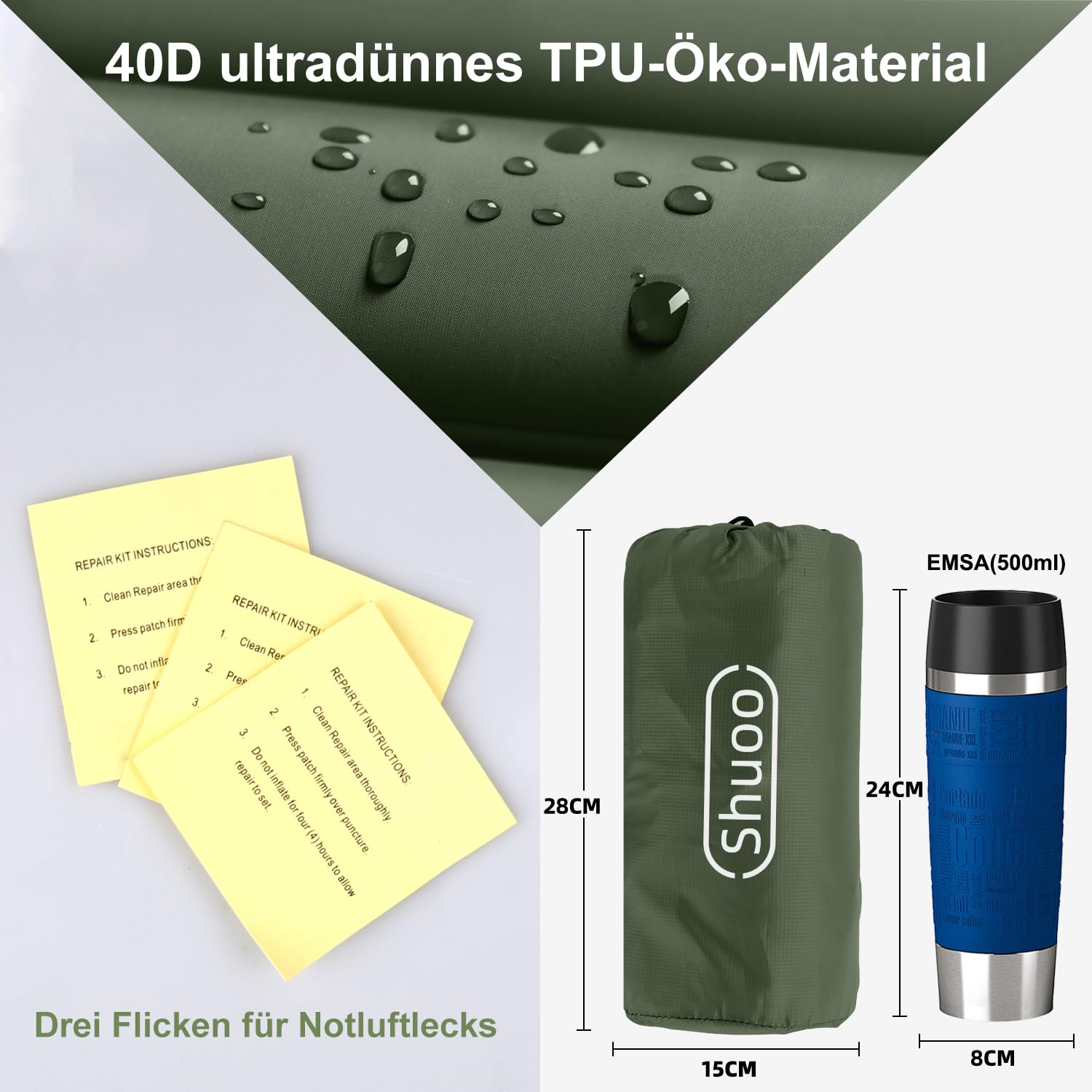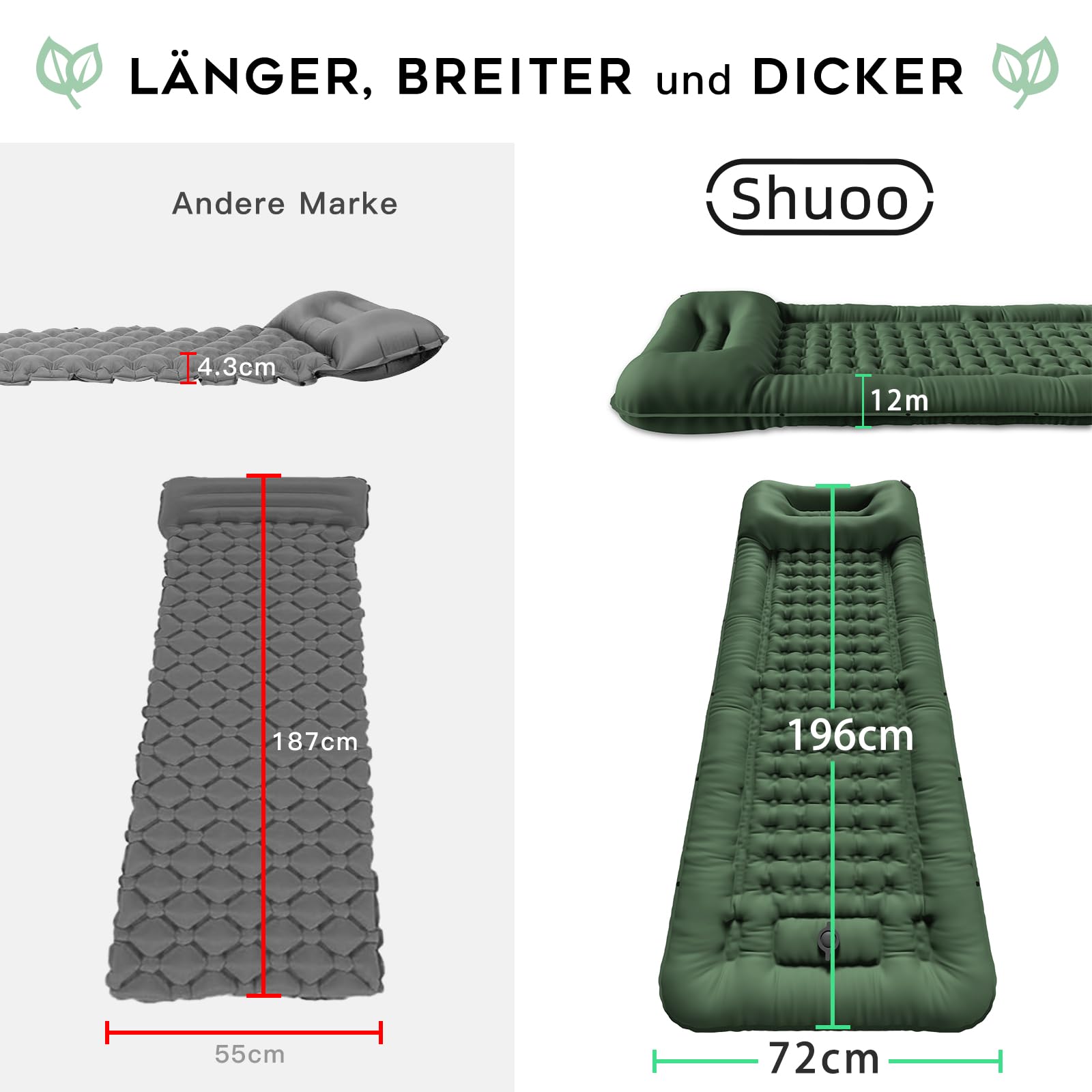 ["【12cm Thick, 72cm Wide and Comfortable】The Shuoo sleeping pad is 4.7 inches thick, 28.3 inches wide, and 77.6 inches long when inflated. Thanks to the latest inflatable sleeping mat technology of 2025, the shuoo sleeping pad is 1.2 to 1.6 inches thicker and wider than comparable products. This means more comfort and more space.","【6.3 inches Thick Pillow & Ergonomically Curved Design】The all-around curved construction with two slightly higher sides and a slightly lower middle ensures that your body stays close to the mattress, giving you a more comfortable sleep. Innovative square air holes provide even pressure distribution, and the integrated 6.3 inches thick pillow supports your head and neck, providing a baby-like sleep.","【Folds as Small as a Thermos Flask】Once you fold the sleeping pad and store it in the storage bag, it is only slightly larger than a thermos flask. This means you can easily carry it around. Weighing about 900g, it is roughly the weight of a water bottle you carry with you, so you can hardly feel it.","【Quick Inflation with Foot Pump in 60s】The Shuoo camping air mattress is equipped with the latest 2025 foot pump technology, reducing inflation time to less than 60 seconds. Simply press the pump with your foot about 100 times to complete the inflation process. Thanks to the optimized deflation valve, deflation and storage are equally easy. Once you master the method, you can deflate and store the sleeping pad in about 20 seconds."]
