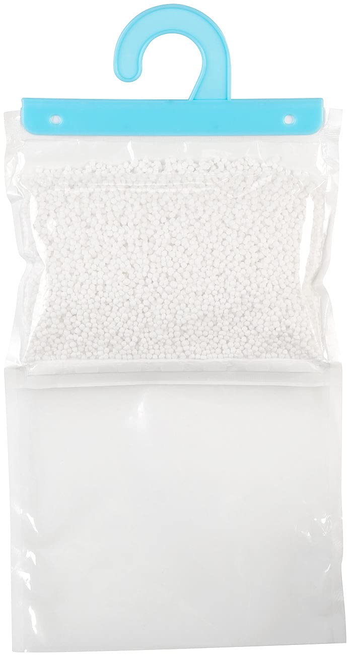 "Protect cabinets, closets, and more from moisture • Three hanging bags with 500 grams of active granules each • Dimensions: 43 x 22.8 x 2 cm each, Weight: 459 g each"