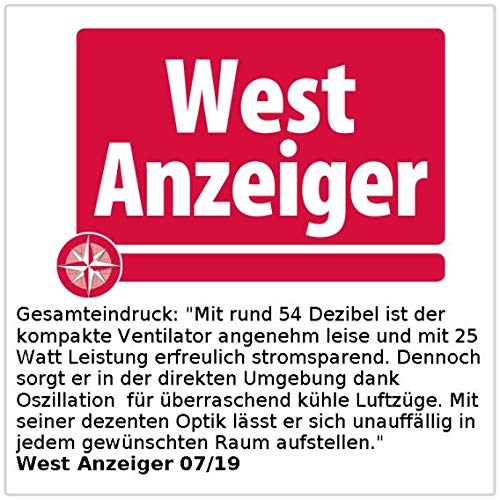 Oscillation: swivels at a 90° angle • Maximum air speed: 0.76 m/s • Power: 25 watts • Power supply: 230 V (Euro plug)