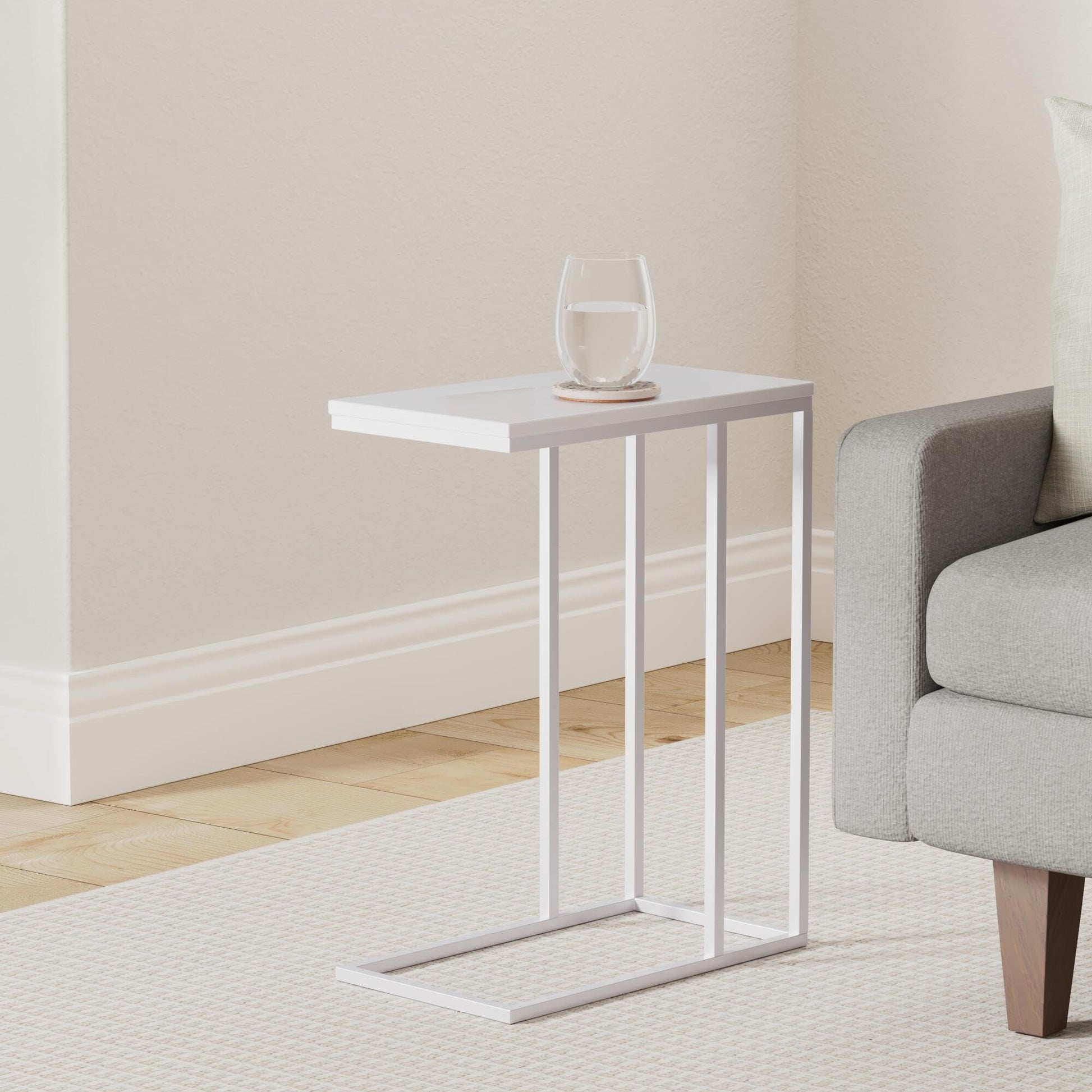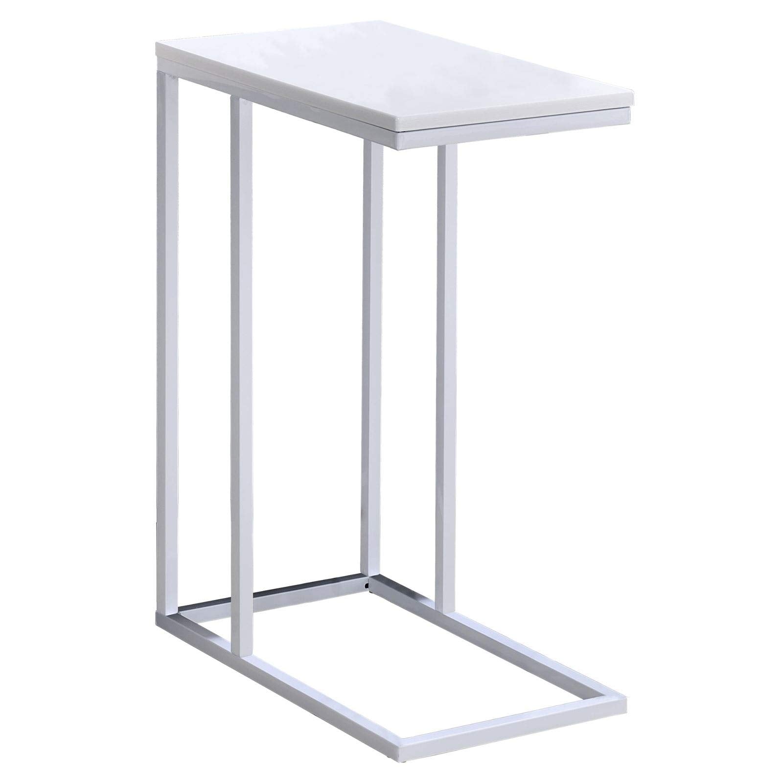 Side table Debora, practical living room table in C-shape, lovely coffee table with rectangular white tabletop, elegant sofa table with white metal frame.