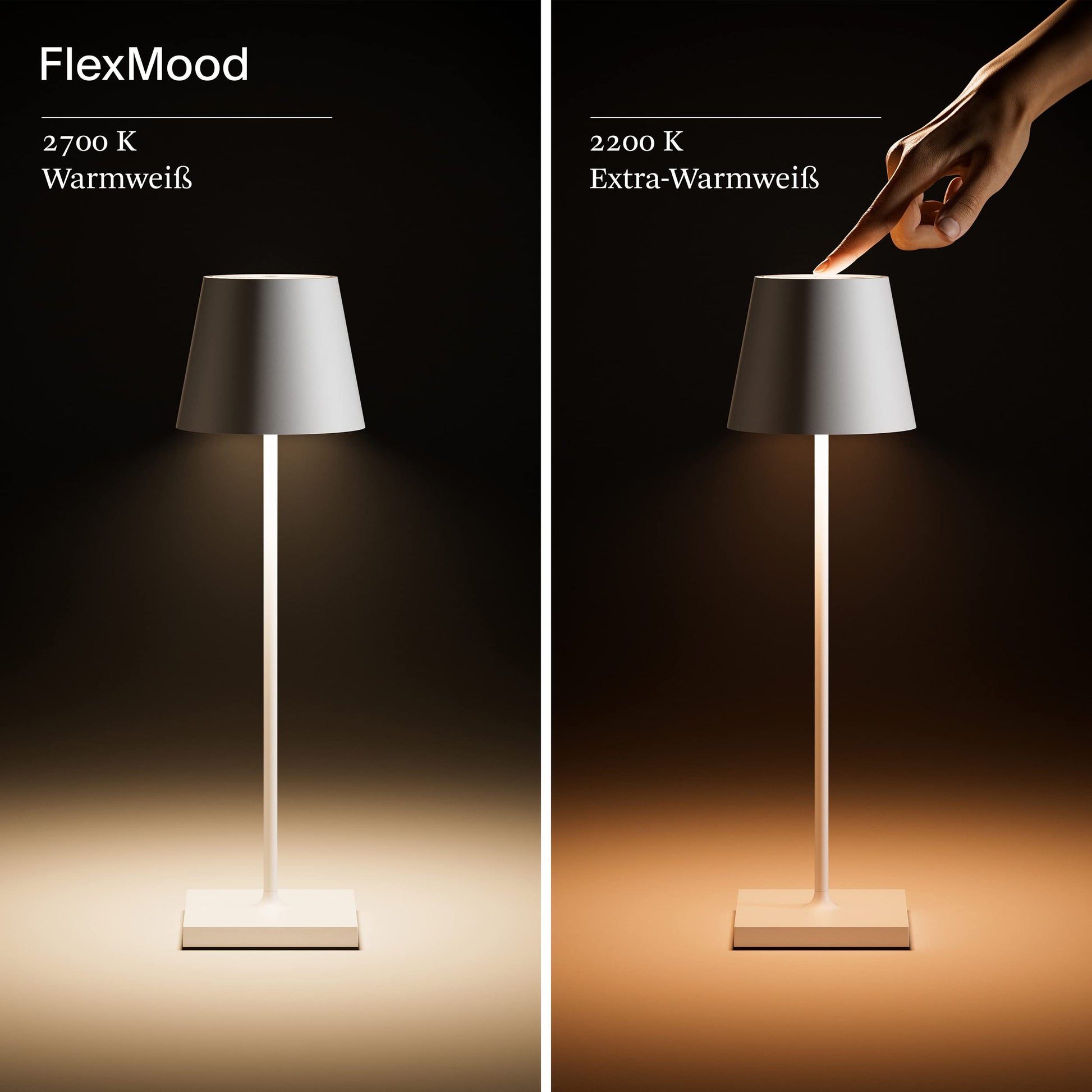 "Atmospheric: The FlexMood feature offers warm white and glare-free light in two color temperatures (2,700 K and 2,200 K) via the touch dimmer. This way, it always creates the right lighting atmosphere - also as a nightstand or reading lamp."]
