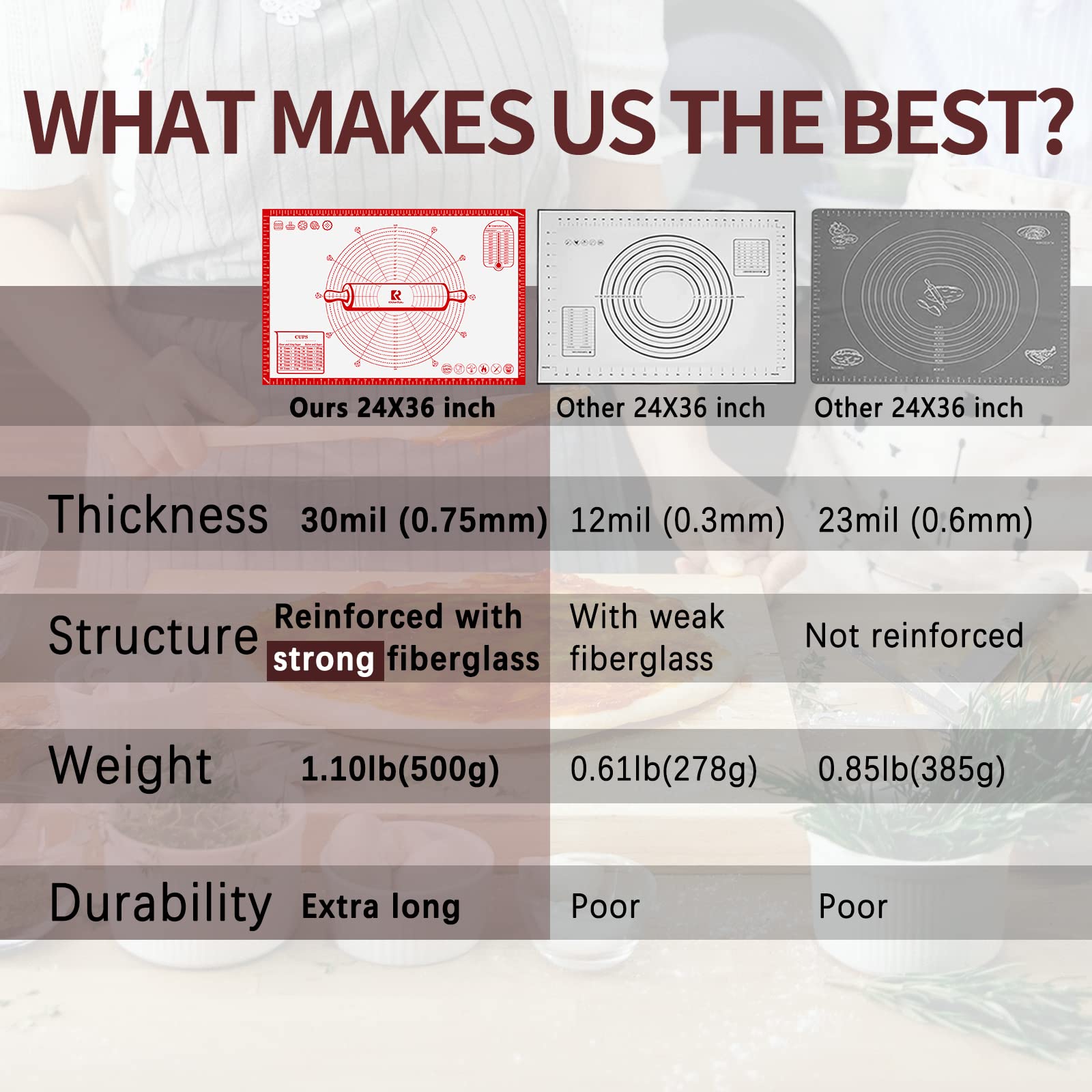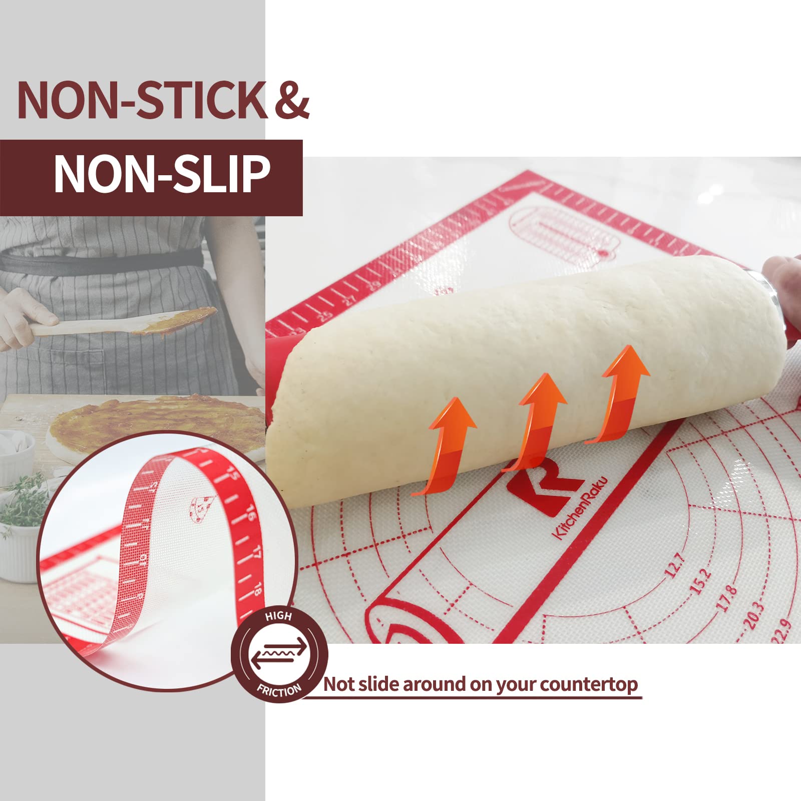 ["【0.7mm double layer and non-slip bottom】The thickness of the mat is 0.7mm, which is double the thickness of other baking mats. This mat has a longer lifespan and does not slip while kneading dough. It does not wrinkle or discolor.","【Non-stick and non-slip】The bottom of the dough mat has a non-slip surface and strong adsorption force, so the mat does not slide back and forth while kneading dough.","【100% food-grade silicone】The baking mat is made of reinforced fiberglass and food-grade silicone. It has passed FDA and LFGB verification and is BPA-free. The mat does not discolor or develop odor after multiple uses due to vulcanization.","【Easy to clean, dishwasher safe】Our dough rolling mat has a non-stick surface. If the mat is greasy or if the dough sticks to the surface, it can be easily washed by hand with soapy water and air-dried to keep the countertop clean. This baking mat is dishwasher safe.","【Multi-purpose】Our BPA-free silicone mat can be used as a rolling mat for pizza, cookies, and cake crusts as well as table, placemat, and pad mats. The silicone fondant mat has a silicone strap to help you fix the silicone mat and save space. It is convenient and easy to store."]