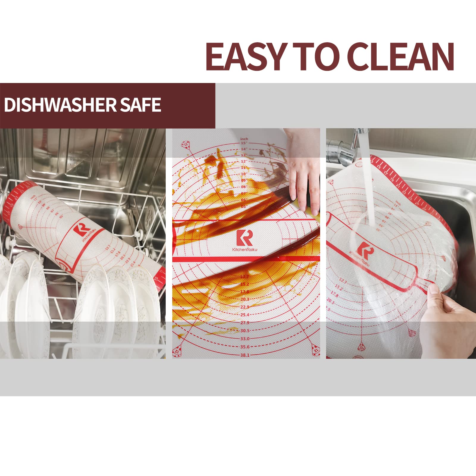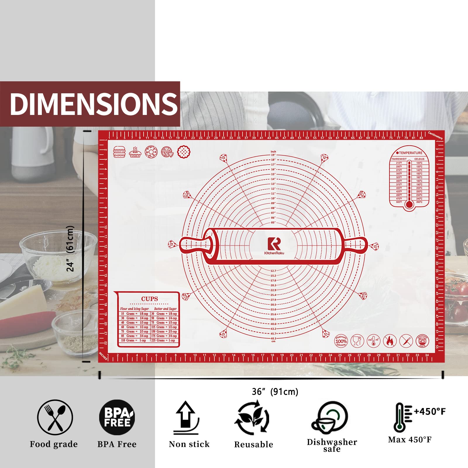 Silicone Baking Mat Extra Large 91x61cm, Antistick Silicone Mat with Measurements, Dough Mat, Baking Sheet for Oven, Rolling Mat for Dough Fondant Pastry by KITCHENRAKU KR, Red