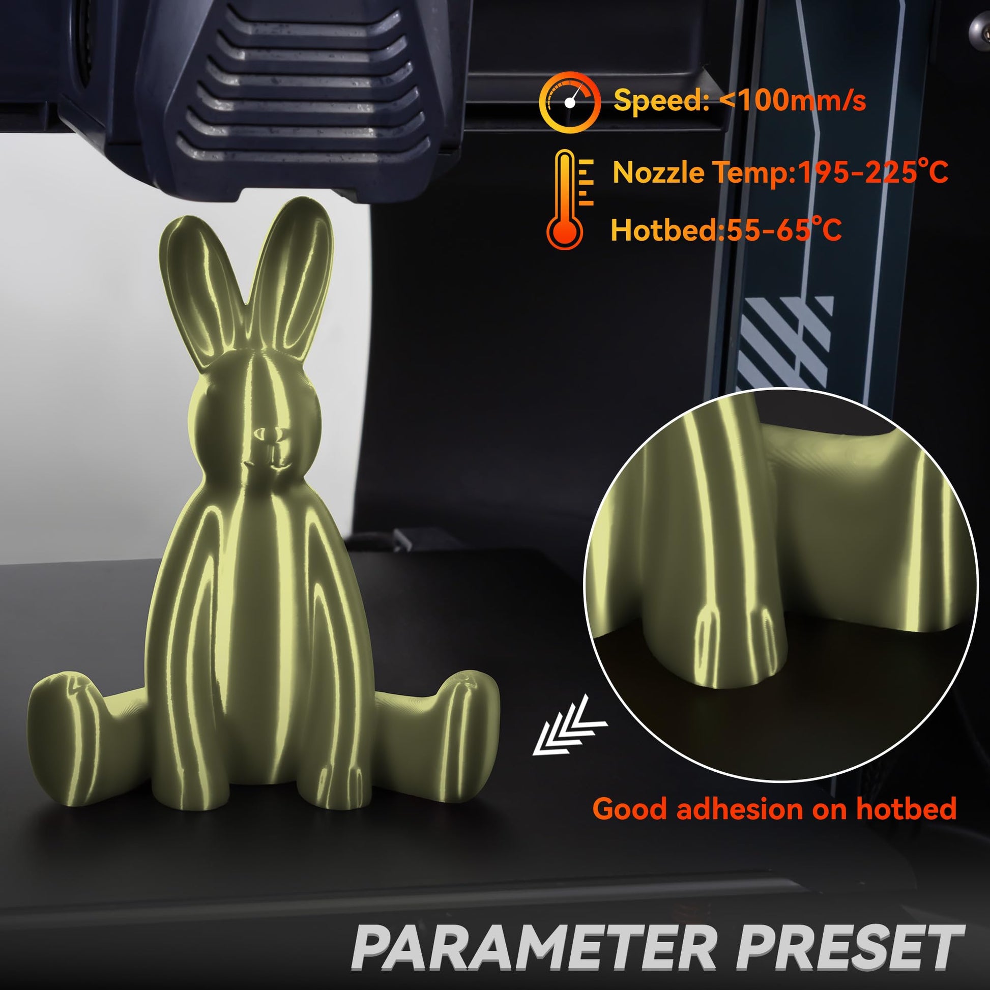 ["Models printed with TINMORRY Silk PLA 3D printing filaments have a silky shine and a smooth, delicate surface, greatly enhancing the beauty and sophistication of the model, making it very suitable for printing decorations, artworks, etc.", "Recommended printing temperature 195-225°C, build platform 60-75°C, printing speed: <100mm/s. 2. Please seal the filament after use to prevent moisture absorption. 3. Please secure the end of the filament after use to avoid tangles.", "TINMORRY PLA 3D printer filament is made of high-quality polylactic acid, with a low melting temperature, easy to use, low deformation and shrinkage, and no odor during printing. It provides excellent surface quality and extremely high dimensional accuracy.", "With a diameter of 1.75±0.03mm, the TINMORRY Silk PLA filament is completely mechanically wound and rigorously manually controlled to ensure clean winding and easy feeding. Made from renewable resources, our PLA 3D printer filament is an environmentally friendly 3D printing material.", "TINMORRY Silk PLA 3D printing filament is user-friendly designed and is an ideal choice for 3D printing beginners. It is compatible with most FDM 3D printers on the market and enables high-quality printing without advanced print settings. If you have any questions using TINMORRY filament, please contact us to receive a filament profile or download it from GitHub."]