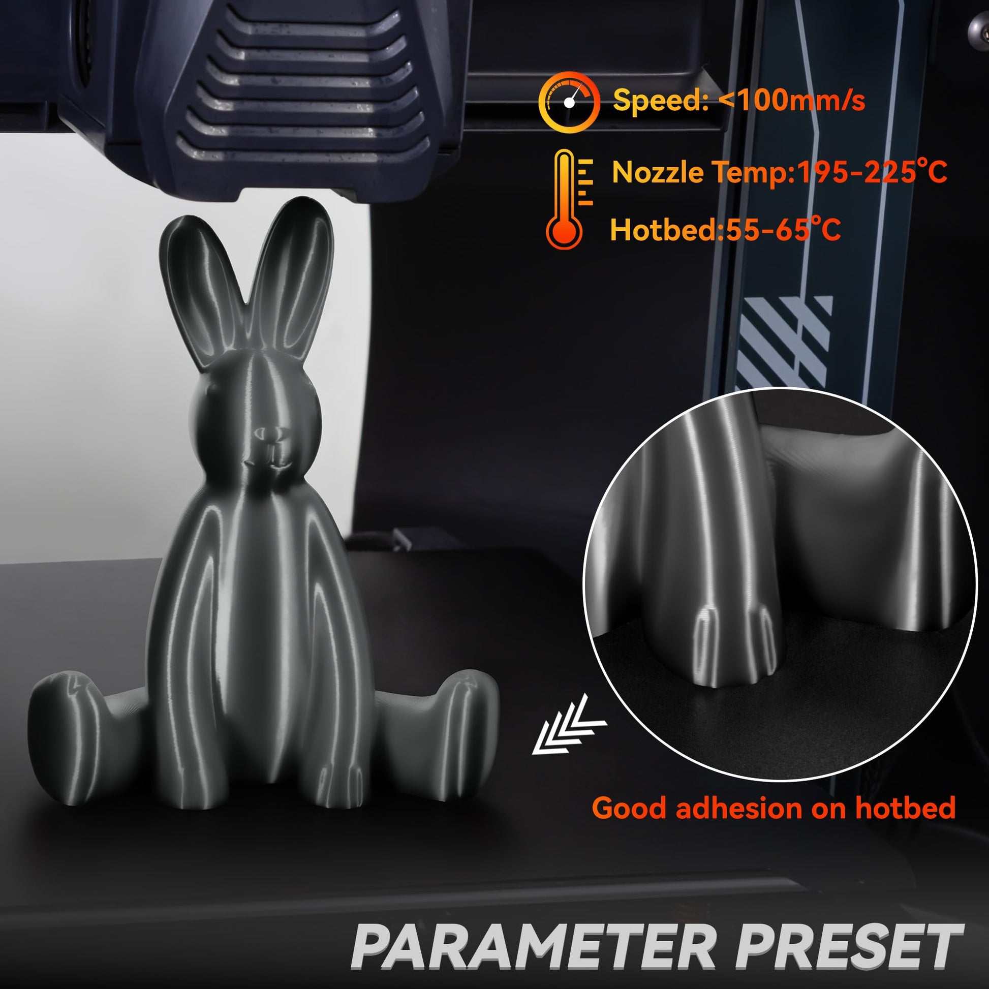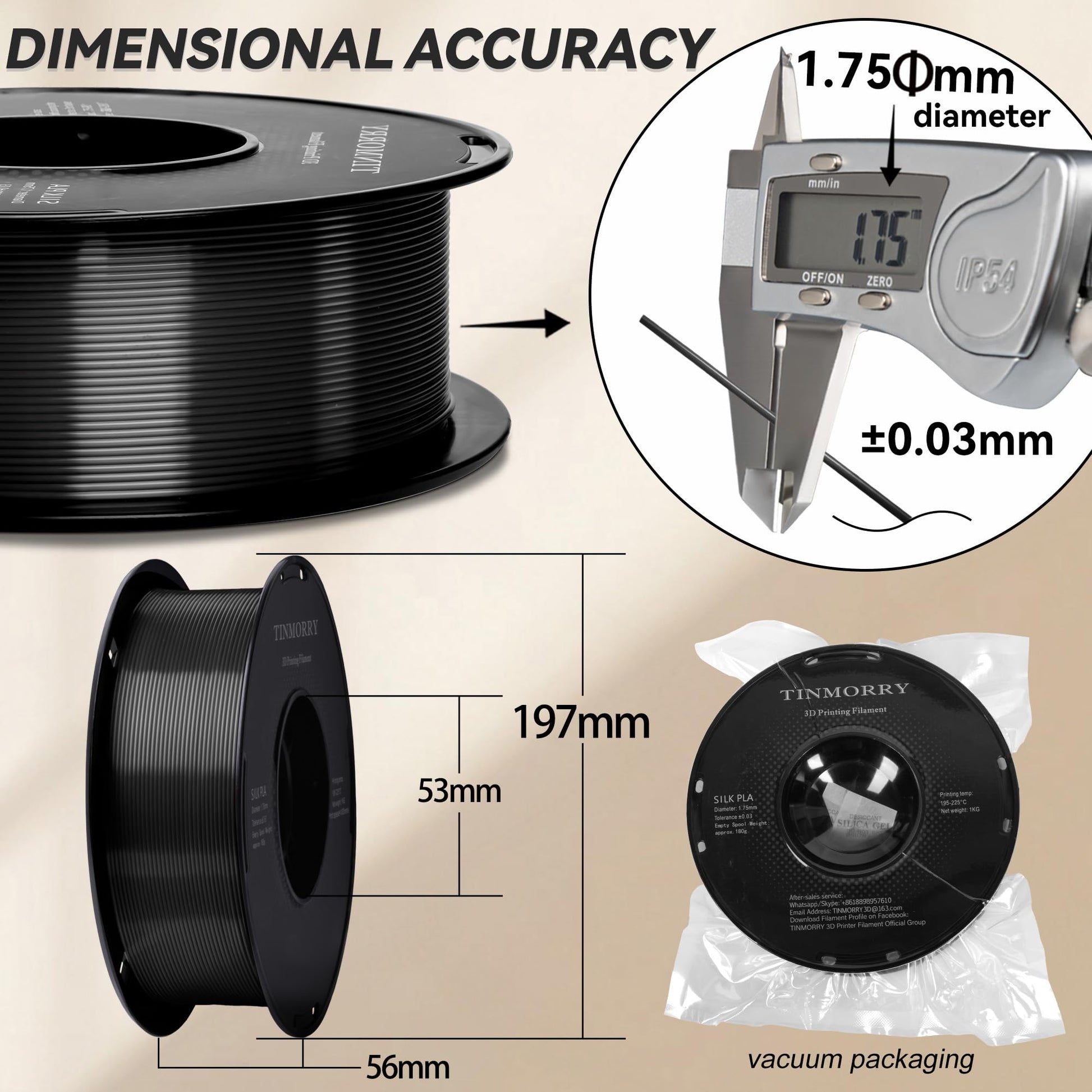 ["【Unique Silk Gloss】Models printed with TINMORRY Silk PLA 3D printing filaments have a silky gloss and smooth delicate surface, significantly enhancing the beauty and sophistication of the model, making it very suitable for printing decorations, artworks, etc.","【Tips for Use】Recommended printing temperature 195-225°C, build platform 60-75°C, printing speed: <100mm/s. 2. Please seal the filament after use to prevent moisture absorption. 3. Please secure the end of the filament after use to avoid tangles.","【Good Printability】TINMORRY PLA 3D printer filament is made of high-quality polylactic acid, with a low melting temperature, easy to use, minimal deformation and shrinkage, and no odor during printing. It provides excellent surface finish and extremely high dimensional accuracy.","【Tangle-free & environmentally friendly】 With a diameter of 1.75±0.03mm, the TINMORRY Silk PLA filament is completely mechanically wound and strictly manually controlled to ensure clean winding and easy feeding. Made from renewable resources, our PLA 3D printer filament is an environmentally friendly 3D printing material.","【User-friendly for new users】TINMORRY Silk PLA 3D printing filament is user-friendly designed and is an ideal choice for 3D printing beginners. It is compatible with most FDM 3D printers on the market and allows for high-quality printing results without advanced printing settings. If you have any questions while using TINMORRY filament, please contact us to receive a filament profile or download it from GitHub."]
