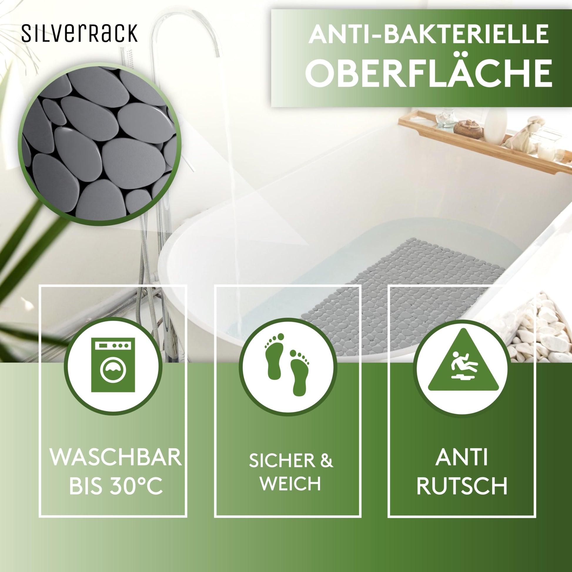 SilverRack bath mat 69x36 cm (anthracite pebble stone look) non-slip bath mat BPA free - shower mat mold resistant & machine washable - non-slip bath mat