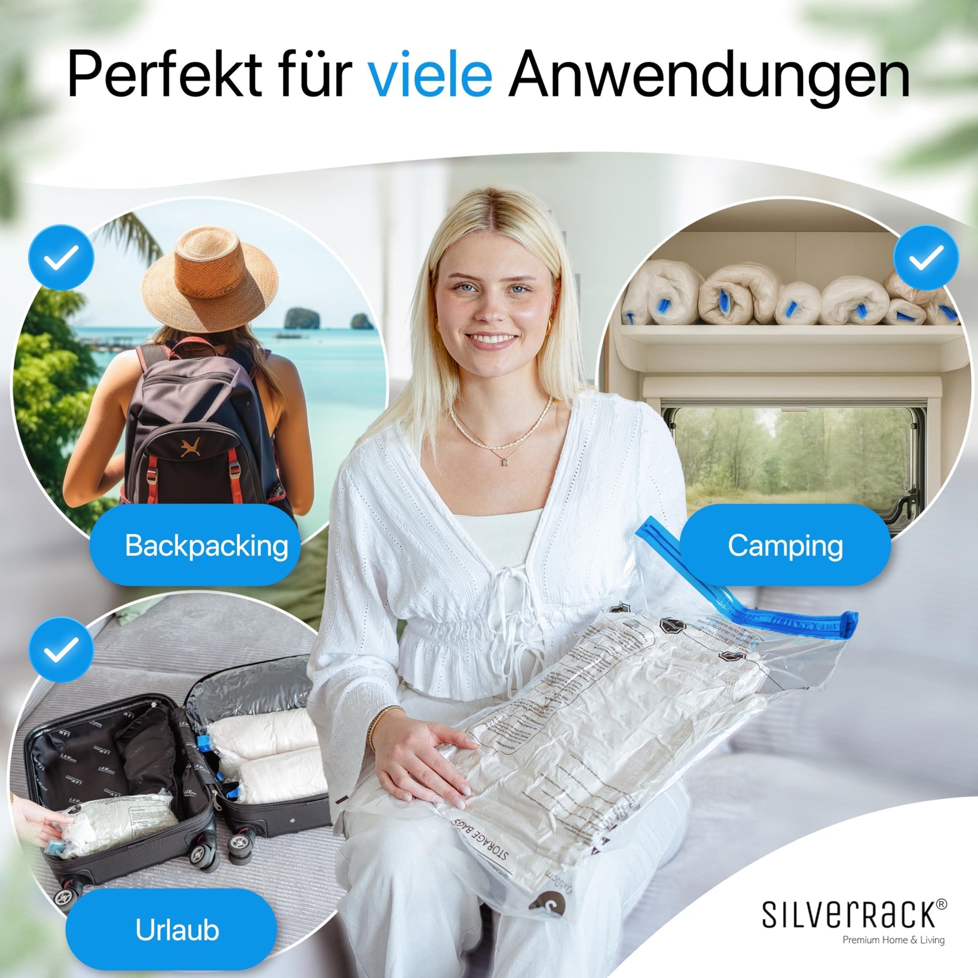 ["✅ UP TO 75% SPACE SAVING - Our Vacuum Storage Bags allow you to save up to 75% more space in your backpack or suitcase: Simply close the vacuum bag at the ZIP, roll out the air from the bag, and you're done!","✅ REUSABLE - our compression bags are ideal for travel or at home. No vacuum cleaner needed, just roll: Perfect for storing dirty or wet clothes while traveling!","✅ PERFECT BAG SIZES - With the SilverRack vacuum bags in sizes 70 x 50 cm, 60 x 40 cm, and 50 x 35 cm, you have the perfect set for swimsuits, underwear, or seasonal clothing: fresh travel clothes safely stored!","✅ HYGIENIC & DRY - The storage bags protect safely against odors, moisture, dirt, and insects: Especially in the suitcase or backpack, the unused items remain 100% protected from wet and used laundry!","✅ QUALITY PROMISE - To make the purchase decision as easy as possible for you, we take the risk completely on us: If you are not 100% satisfied, you will get your money back - Up to 60 days after purchase and without any ifs or buts!"]