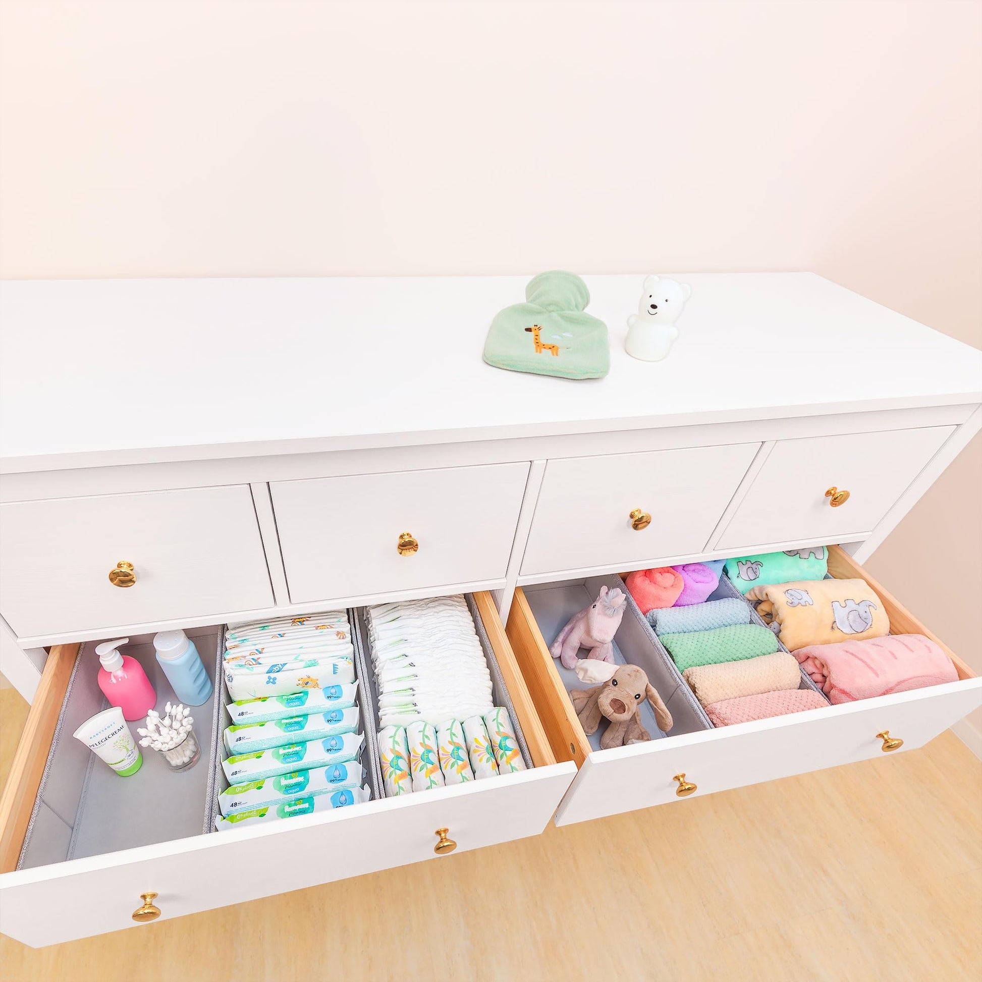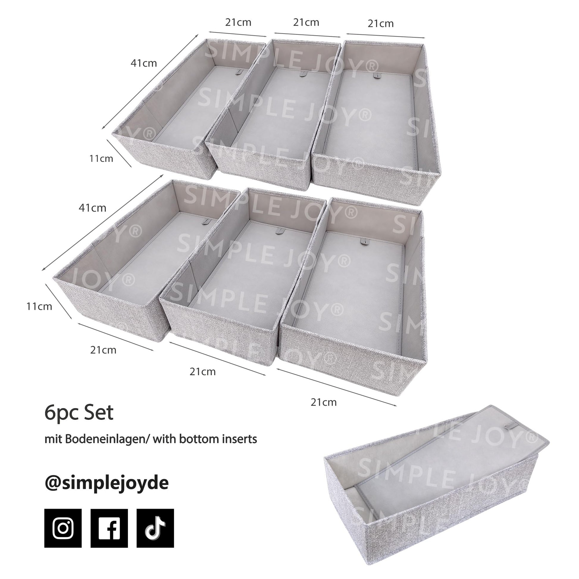 ["Perfect fit in Ikea HEMNES double dresser 160cm","TÜV Rheinland certified: pollutant tested","🇩🇪 Registered German and EU Union brand SIMPLE JOY","🇪🇺 Registered EU design patent. Heart and soul in every design!","Family business from Westerwald, Germany","6-piece set for changing and nursing needs, toys, towels, children's and adult clothing","Fabric boxes with stable base; Polypropylene inner structure, sturdy & odorless"]