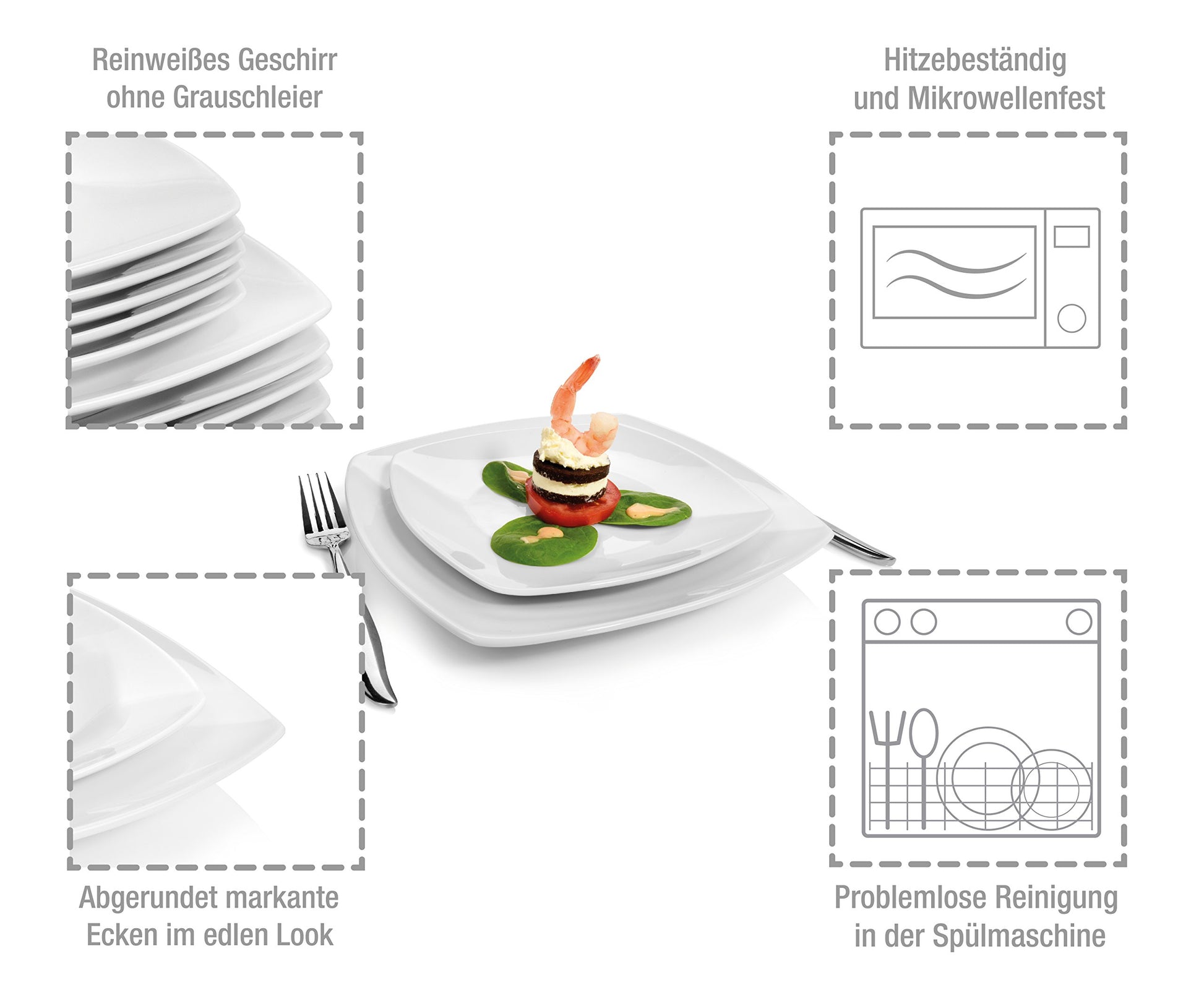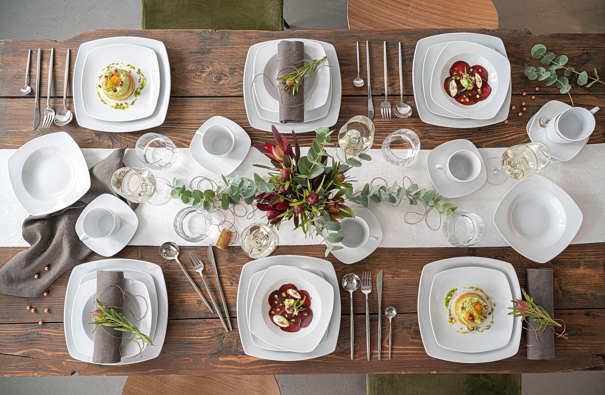 SINGER | 30-piece dinner set, porcelain tableware for 6 people, dishwasher-safe plates set, dining set with dinner plates & coffee service, square white tableware | PREMIUM COLLECTION