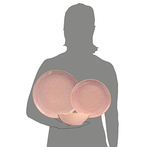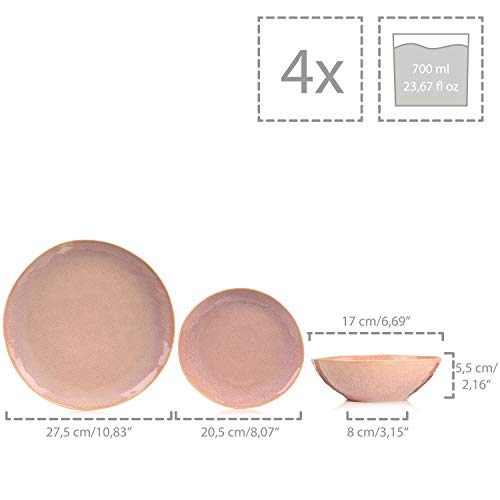 ["DINNERWARE SET FOR 4 PEOPLE: With this tableware set, you can serve an excellent dinner for 4 people. The set includes 4 dinner plates, 4 dessert plates, and 4 bowls","ELEGANT DESIGN: Dishware in a rose tone may seem sweet and playful at first, but on the dining table it appears delicate and elegant, especially with the gold rim and fine imperfections","PREMIUM QUALITY: This 12-piece dish set stands out not only for its unique design but also for its high quality. The dinnerware set is dishwasher and microwave safe","BRAND QUALITY BY SÄNGER: Here you will find a wide selection of high-quality dishware. We focus on both aesthetics and quality, from timeless designs to exceptional pieces","NOTE: The manufacturing process uses a technique that creates a naturally vintage look with few isolated flaws. As a result, there may be slight color variations"]