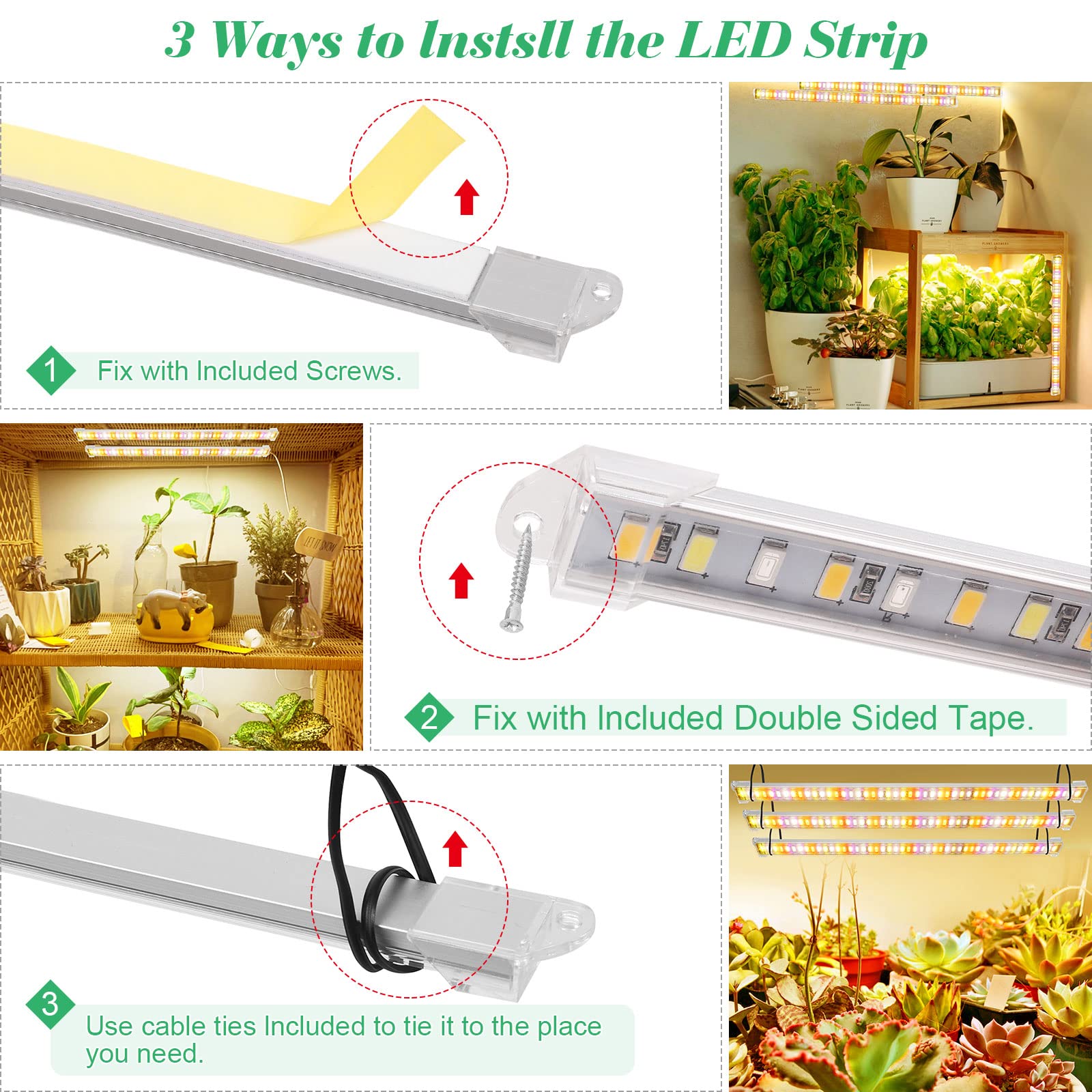 ["Full Spectrum Growth Light Strips: This is a real LED plant light that provides full spectrum lighting. Achieve higher yields while saving energy costs.","Automatic on/off and Timing Function: This LED growth light strip has a circular memory timer function. It has 3 timing modes, 4H, 8H, and 12H, which you can select according to your plants' needs. After setting the hours, leave the power on, the light will automatically turn on at the same time the next day, so you don't have to worry about turning on the light.","10 adjustable brightness levels and 8 lighting modes: 10%-100% can meet the lighting requirements of each plant in different stages. In addition, this plant light has 8 lighting modes. You can turn on or off 1/2/3/4/5/6/7/8 light strips to control the light intensity. Compared to other light strips, it contains 384 LEDs. Our plant lights are brighter and last longer than 50,000 hours.","Easy to install: Comes with 16 screws, 16 cable ties, and 8 double-sided tape for installation. The compact design fits various fixtures and surfaces and can adhere perfectly to shelves. The power cord is 109 inches long, which is sufficient for use in offices, indoors, plants, shelves, greenhouses, etc.","Wide application: Our plant light kit is perfect for flowers and vegetables, especially on rainy, snowy, cloudy days, and dark indoors."]