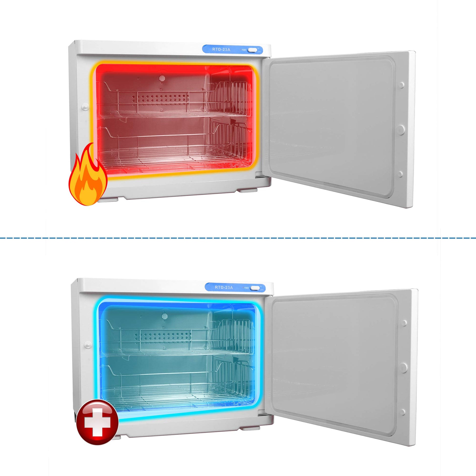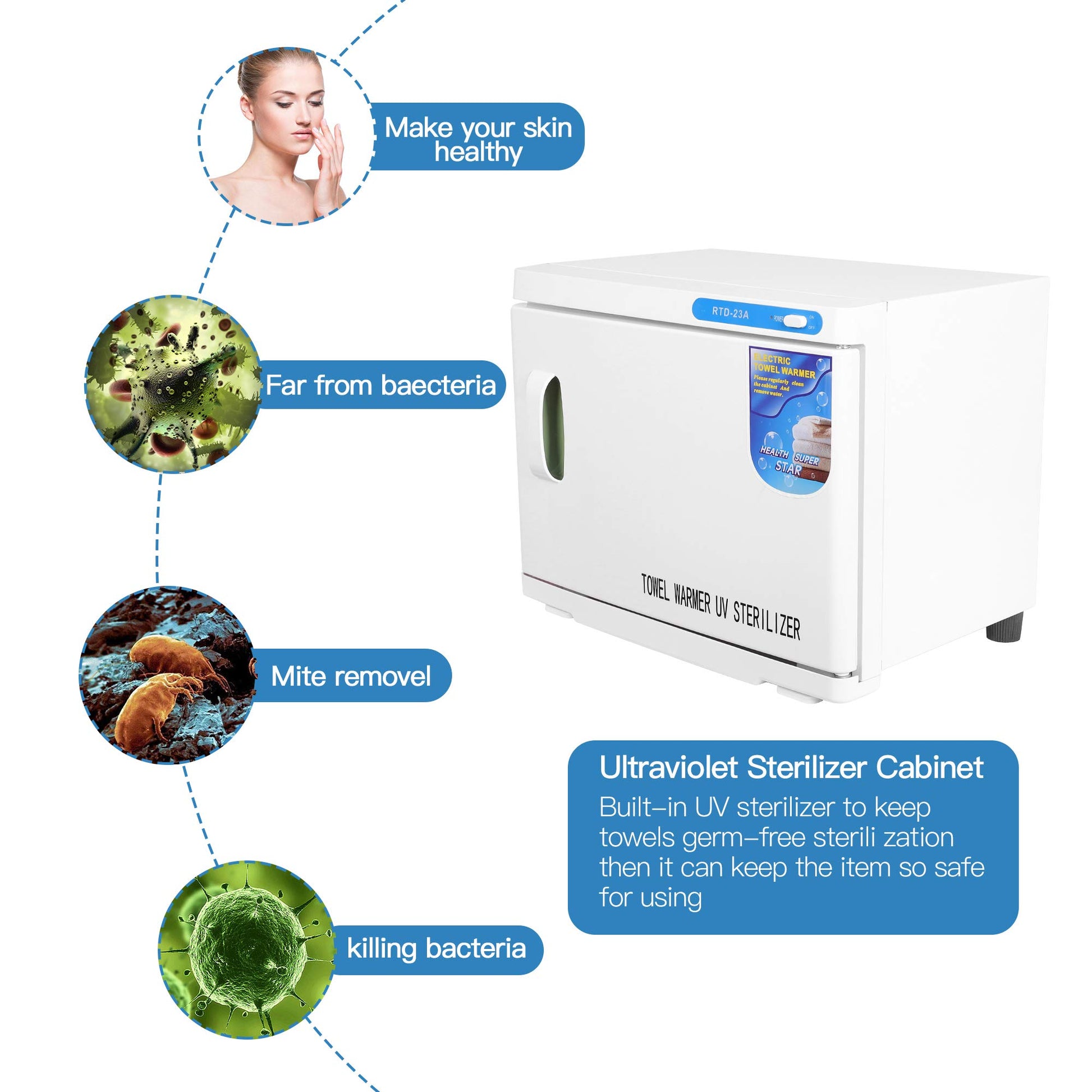 ["【UV Sterilization Rate of 99%】: Virus can cause fever, abdominal pain, and diarrhea, and if it continues, it can lead to hepatitis, gastritis, stomach ulcers, and even stomach cancer. Infrared disinfection can kill 99% of the virus. It is very necessary for your health to regularly disinfect the towel for your family.","【Design】: The towel warmer is made of high-quality steel plates, which are sprayed on. The inner tank is made of stainless steel and is equipped with a curved plastic door. The device is both practical and visually appealing.","【Automatic Heating】: The towels are heated with a heating wire to accelerate the warming of the towels.","【Technology】: The towel warmer is equipped with a stainless steel towel drying rack. The shelf is removable, easy to clean, very durable, and visually appealing.","【Safety】: The towel warmer is equipped with an external water tank that absorbs the moisture produced during heating. The water tank is very easy to remove and clean."]