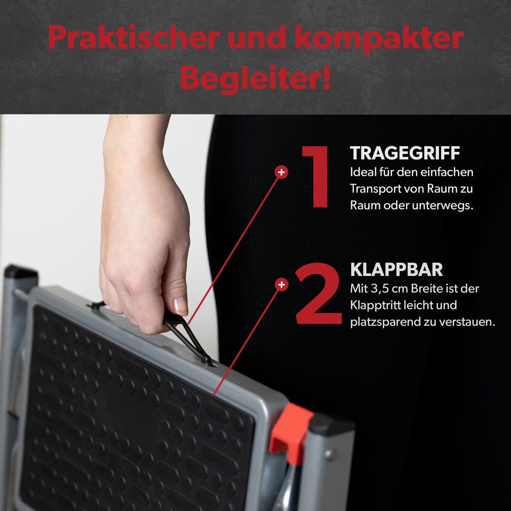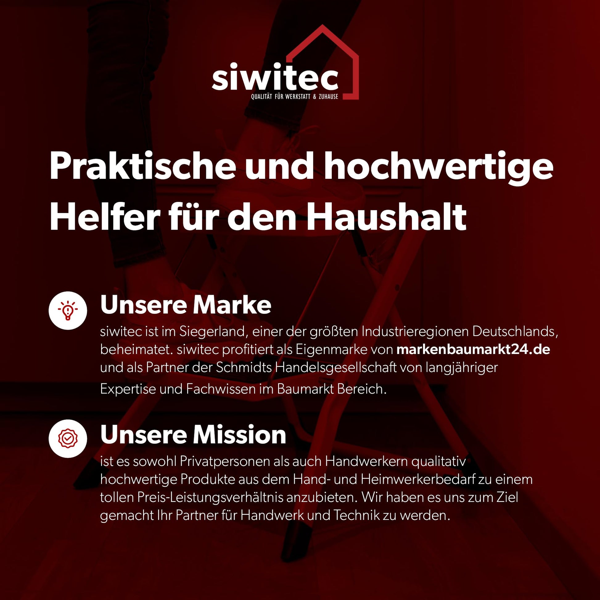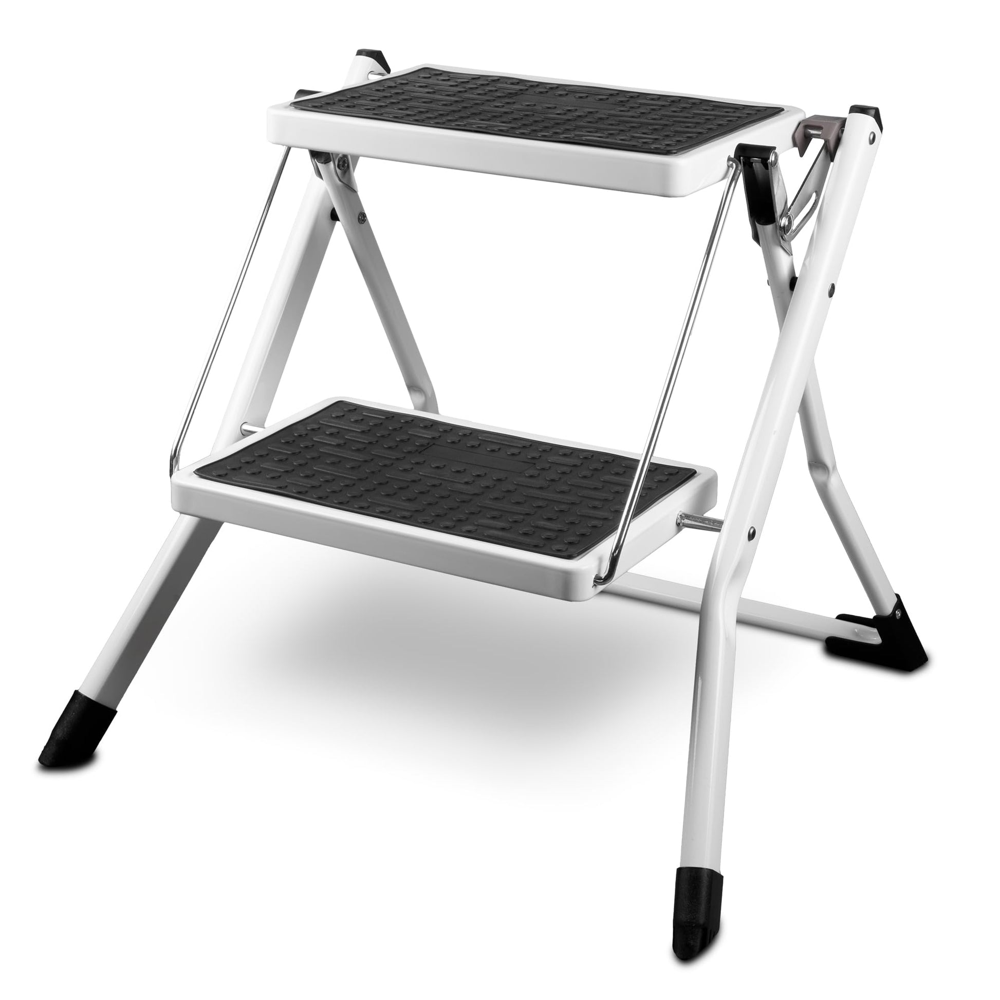 ["PERFECT ALL-ROUNDER - The 2-step stool from siwitec in white with TÜV/GS certificate is a must-have in every household.","SMALL & COMPACT - Once folded, the small step ladder takes up hardly any space, thanks to the carrying handle you can easily and effortlessly transport it.","SAFE & STURDY - The feet of the folding step stool are rubberized to ensure a secure footing, together with the wide XXL steps, allowing for use on different surfaces.","HIGH-QUALITY & ROBUST - The footstool is made of steel according to the DIN EN14183-B-2 standard and can support a total weight of up to 150 kg.","PRODUCT DETAILS - Dimensions (open): 49.5 x 48.5 x 43.5 cm | Dimensions (folded): 49.5 x 3.6 x 54.5 cm | Color: White | Step width: 20 cm | Weight: 3.42 kg | Standard: DIN EN14183-B-2 | Frame material: Steel | End cap material: PE | Mat material: PP"]
