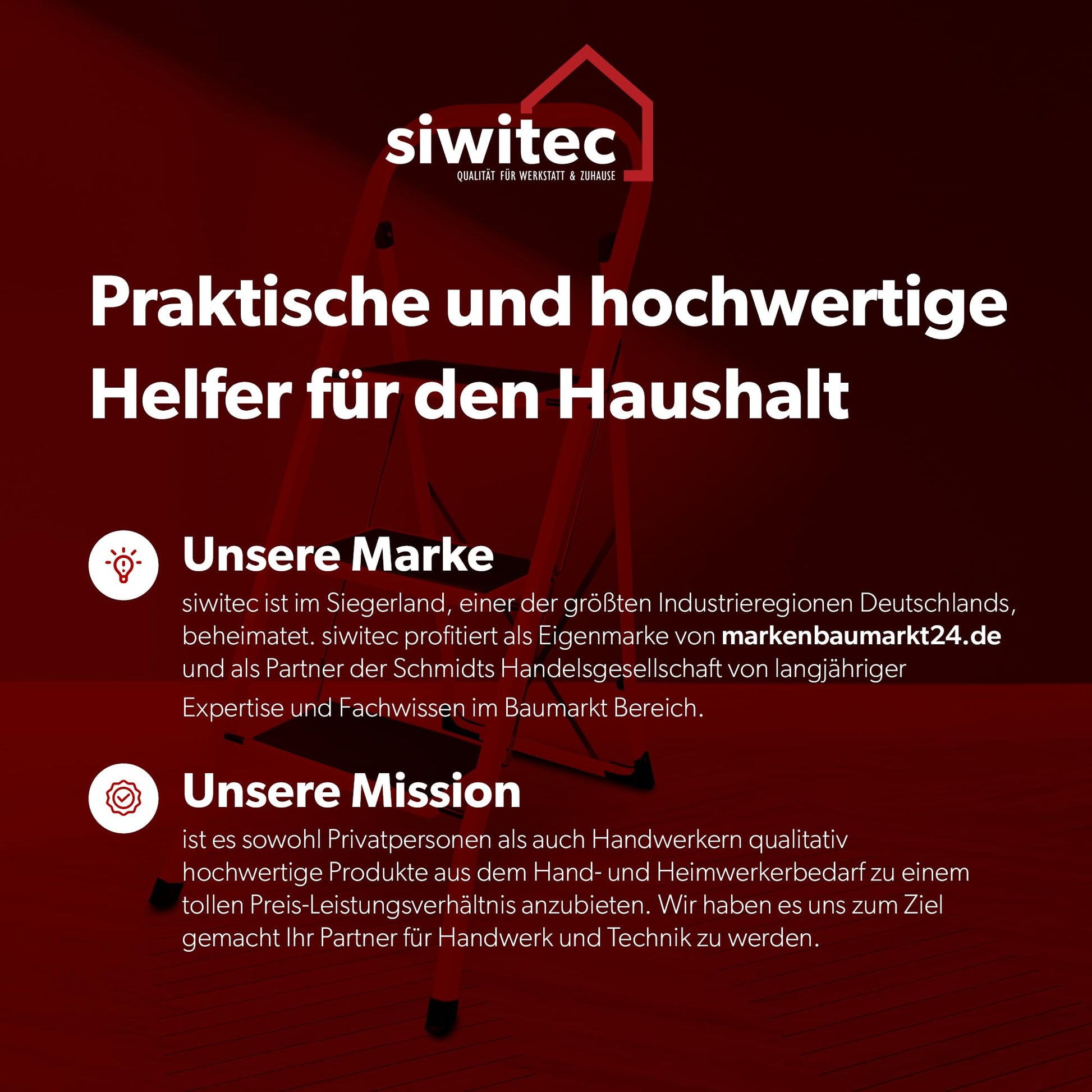 "VERSATILE USE: The practical siwitec folding step stool with handrail for safe ascent and descent is ideal for work in the kitchen, living and working rooms, or even in the garage. A MUST-HAVE for every household!","SAFE & STURDY: The step ladder has 3 extra wide steps (30 x 20 cm) with black anti-slip mats and rubber feet, as well as a safety lock for extra stability.","PRACTICAL & COMPACT: The small household ladder is quickly and easily stored in a space-saving manner, with a depth of just 5 cm, it fits into almost any niche. When folded, it has dimensions of 117 x 47 x 5 cm.","TÜV/GS CERTIFIED: Your safety is important to us, which is why the step ladder was manufactured according to the EN14183-B-3 standard and has received the TÜV seal of approval.","HIGH-QUALITY & ROBUST: The folding step stool is made of high-quality steel and has a maximum load capacity of 150 kg with a weight of 5.84 kg."