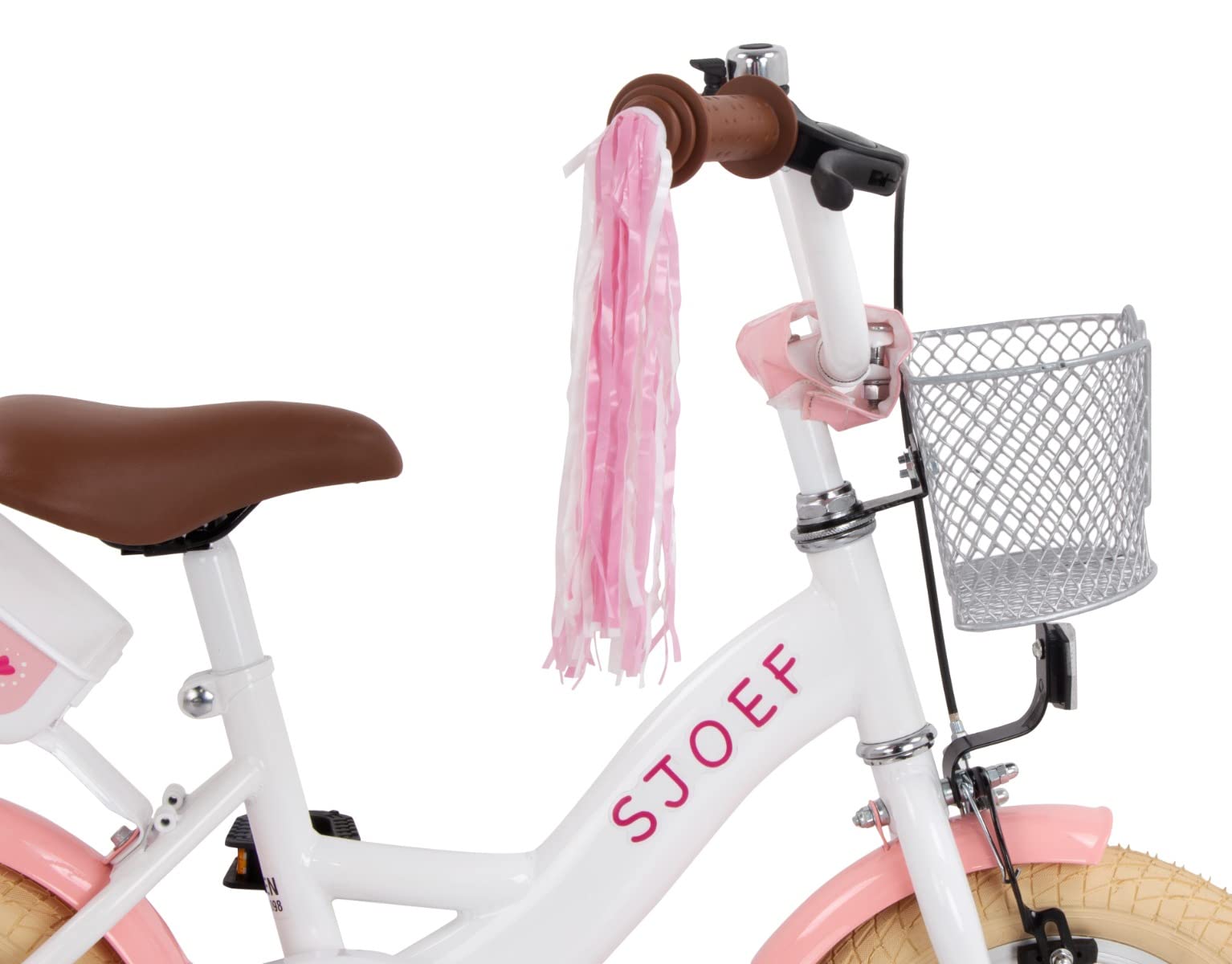 ["SJOEF DOLLY GIRLS' BIKE - Designed in Amsterdam and specially for kids. Absolutely on-trend! Sjoef products have been popular with children for a long time! Sjoef bikes stand out with high-quality appearance and handling.","INCLUDES REMOVABLE TRAINING WHEELS - The training wheels ensure that your child learns how to ride a bike early with a handy tool. Once your child no longer needs training wheels, they can be easily removed.","CHILD-FRIENDLY BRAKE SYSTEM & SAFETY - All our bikes are equipped with hand brakes and coaster brakes, namely two independent brake systems to ensure your child's safety. The chain guard, pad, and handlebar edge protector protect your child's safety.","SUITABLE FROM AGE 2: This bike is suitable for children aged 2 to 4 years and a height of 95cm. The height of the handlebars and saddle can be adjusted to accompany your child's growth for a certain period of time.","EASY TO INSTALL - The kids' bike comes with 95% pre-assembled body and basic assembly tools, only requiring a pump for the tires. Typically, a beginner takes about 5-10 minutes to assemble it. If you have any problems with assembly or the bike, please contact us."]