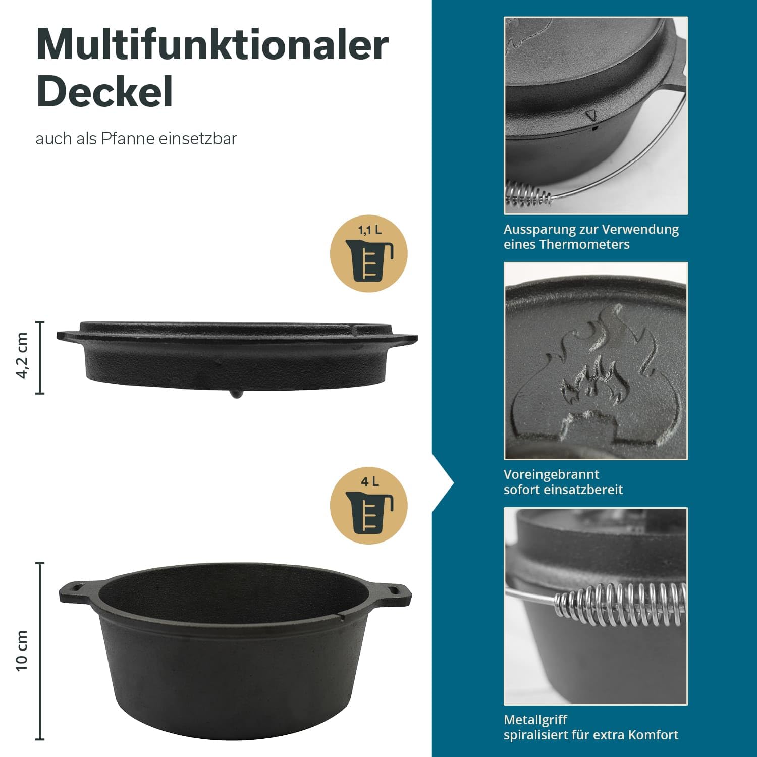Vielseitig nutzbar: In the garden, while camping, in the oven, or on the stove for cooking, roasting, stewing, grilling, frying, steaming, and baking. The lid also doubles as a pan and there is a notch on the edge of the pot for a thermometer.